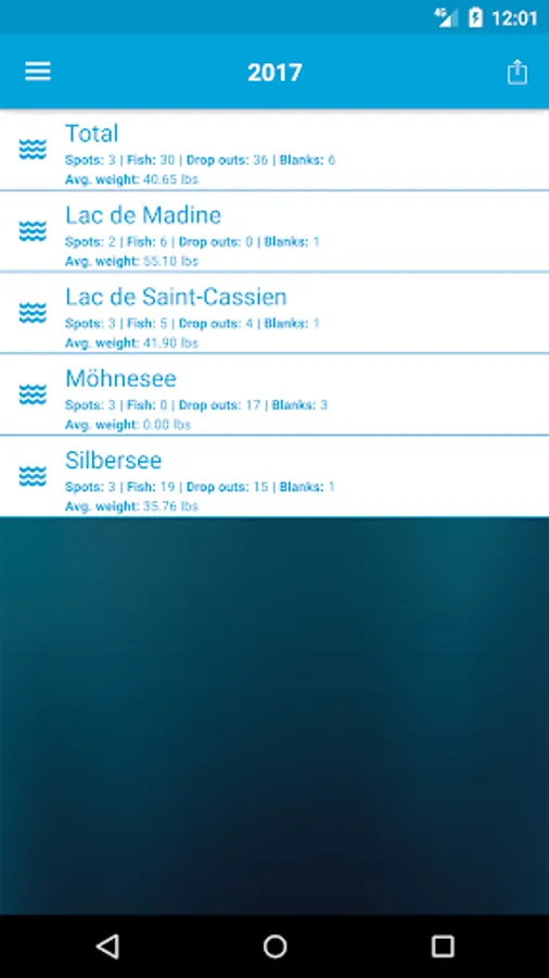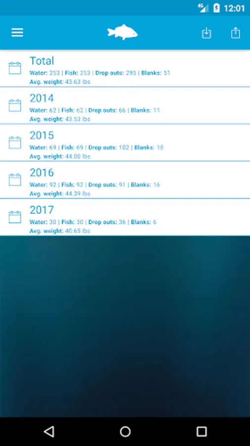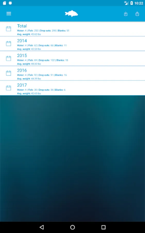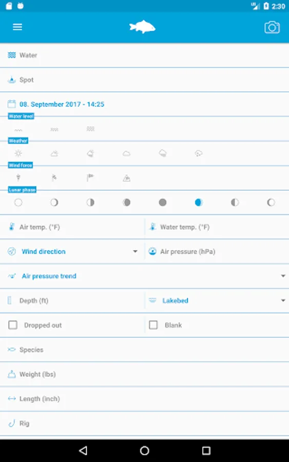 On the basis of water, spot, date and time, water level, weather, wind force, lunar phase, air temperature, water temperature, wind direction, air pressure, species, weight, rig, bait or any other remarks you can analyze your catch success and make the right conclusions when it’s time to be at the water.