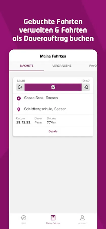 With the flexo app, travel requests can be easily requested and booked. It is also possible to book regular trips. Simply enter your start and destination or select the nearest flexo stop on the map and request a ride. The next possible trip with flexo is displayed. If it meets your requirements, it can be booked with binding effect.