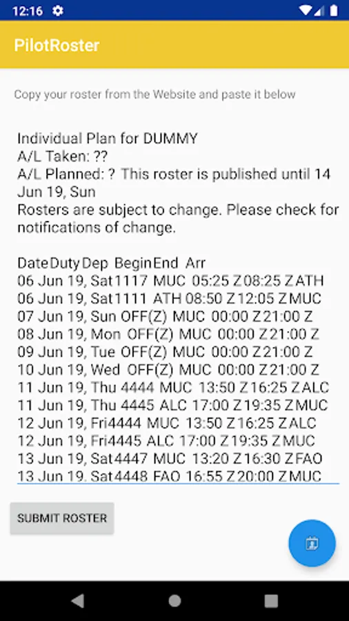 The app currently only supports the rosters of Ryanair. However, you can test the app with an example roster via the menu.