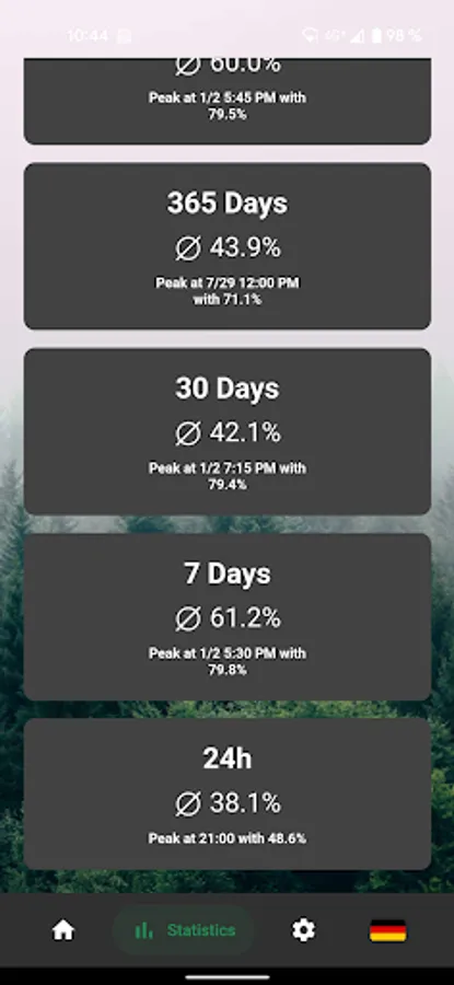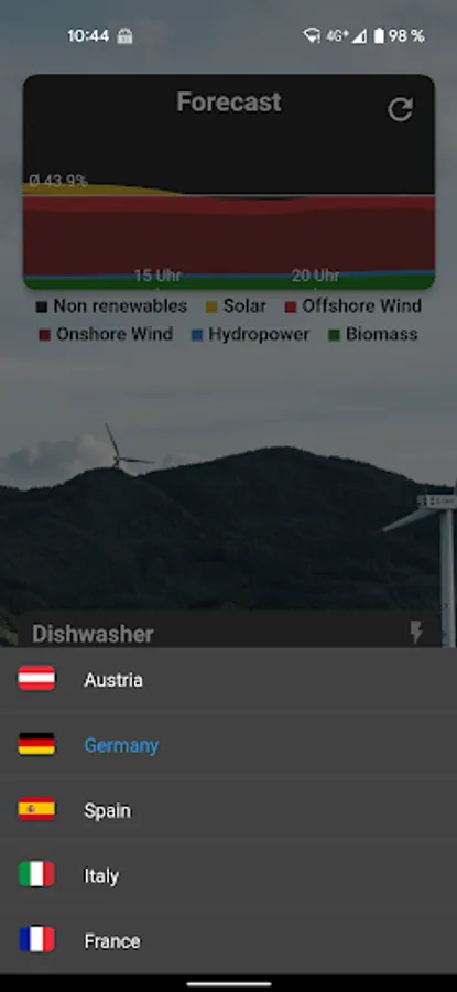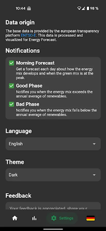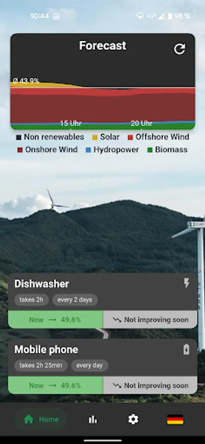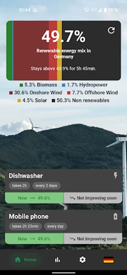 This app helps you detect when energy is renewable and helps to discover the cloudy days and nights without any wind by presenting the current percentage of renewable energy of your countries energy and how it will change in the near future with a forecast. Data for the next day arrives around 6pm.