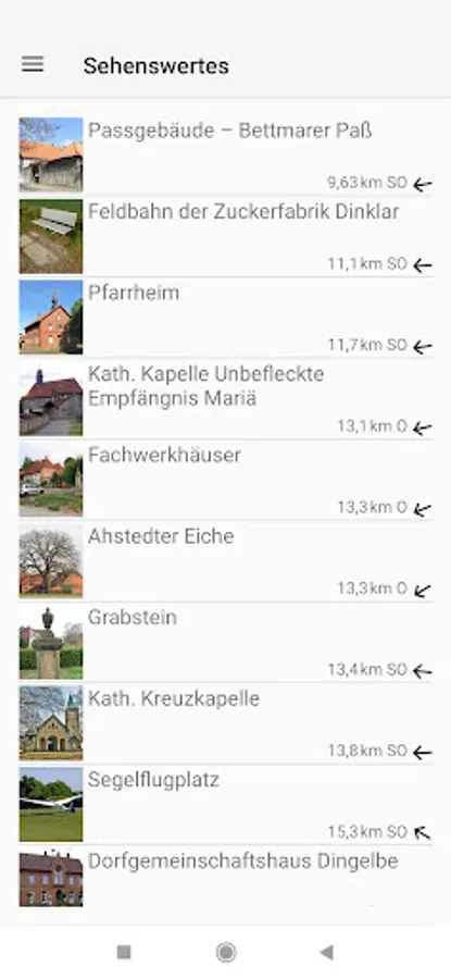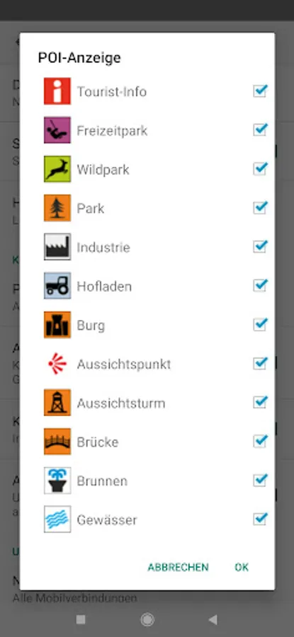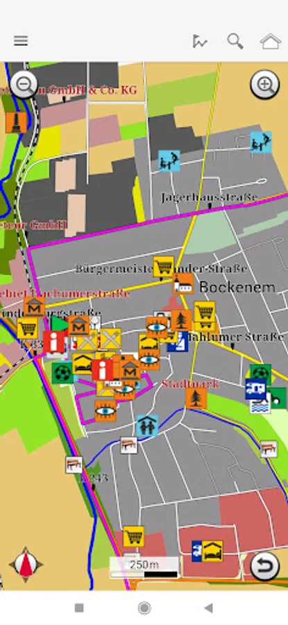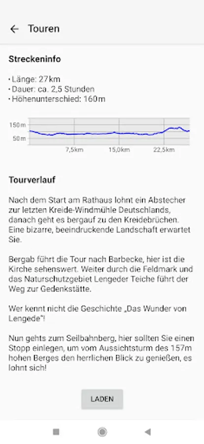 In the main menu you will find a list of points of interest sorted by distance from your current location. A tour is linked to most sights, which you can call up in the detailed view of the information point via the tour icon. After calling up the tour, the course is displayed on the map and the hike or bike tour can start. Your position is constantly tracked on the map. How far the way to the destination is is shown by the remaining kilometers display at the top of the screen. If you leave the route, for example by making a wrong turn, a warning tone sounds. Arriving safely and relaxed at your destination is no problem.
