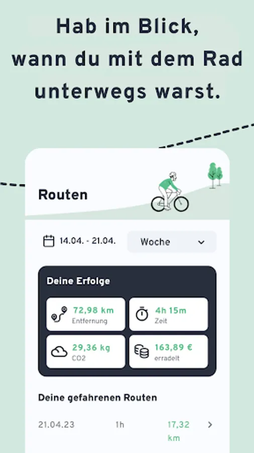 • In the "Routes" and "Savings goal" archives, you can see exactly when you were out cycling and how much you achieved as a result.