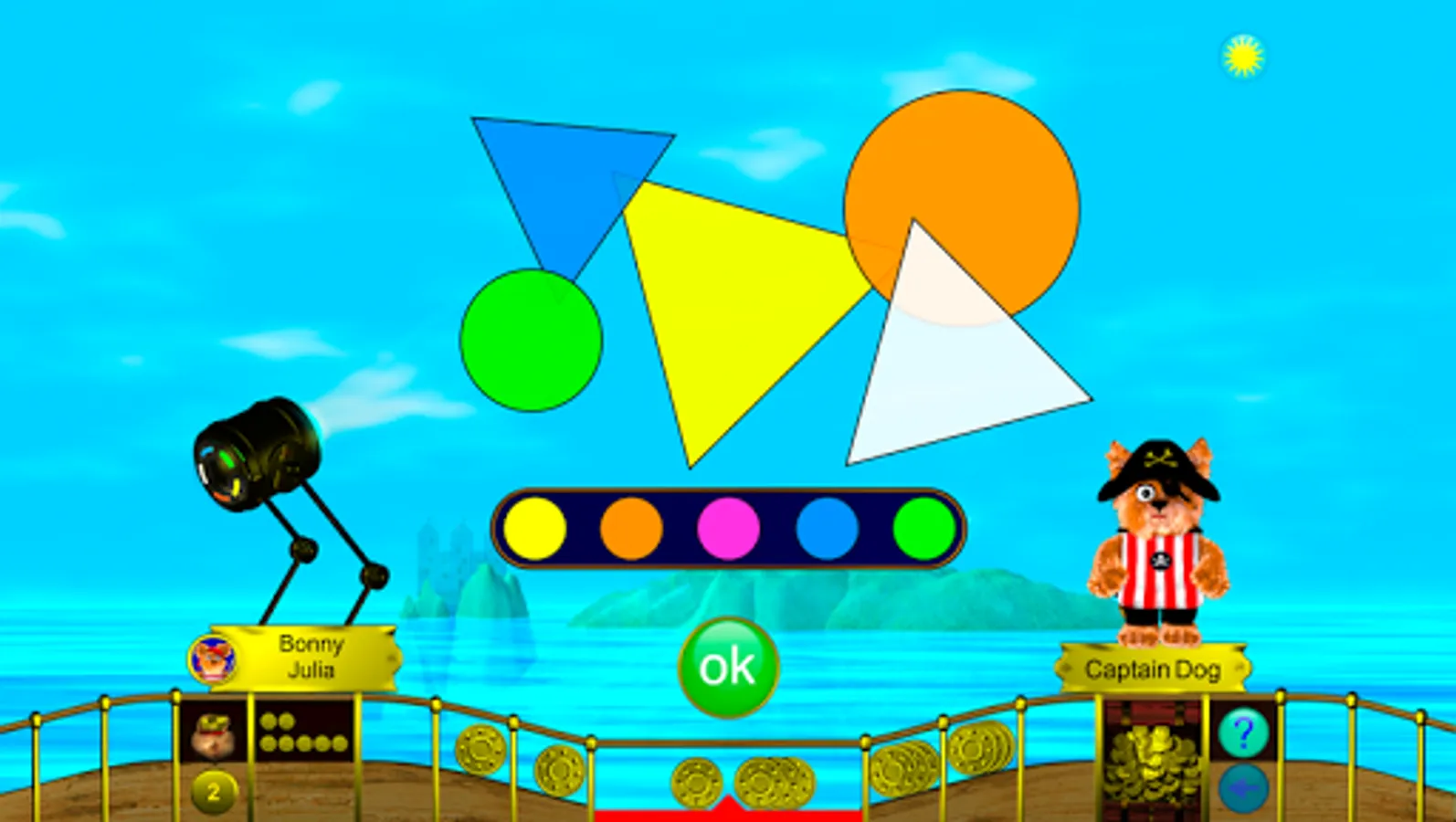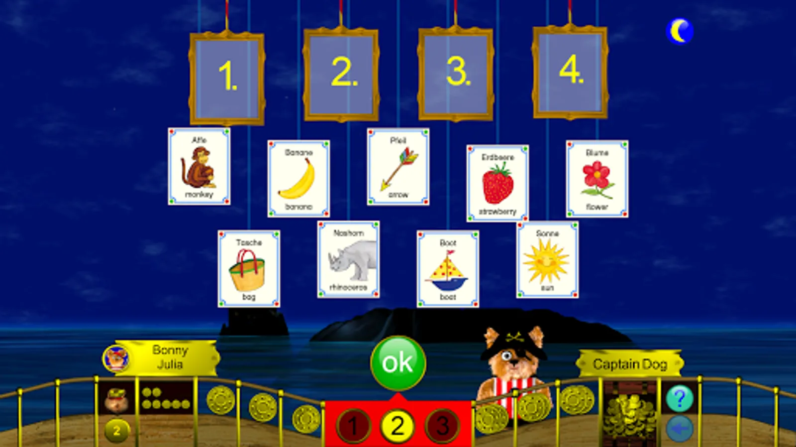 Captain Dog opens his treasure chests and sells the most beautiful pieces. The players need gold coins which can be won in different games. First, the players may choose a game, then it‘s Captain Dog’s turn. This guarantees that not only the favorite games are selected. Depending on the level of difficulty, players can win 1, 2 or 3 coins for any task which is solved correctly. The more difficult the task the higher the profit. But watch out! Whoever makes a mistake unfortunately has to watch Captain Dog grab the gold coins! The players get an immediate feedback on whether the task was solved correctly or incorrectly and the gold coins will be distributed accordingly.