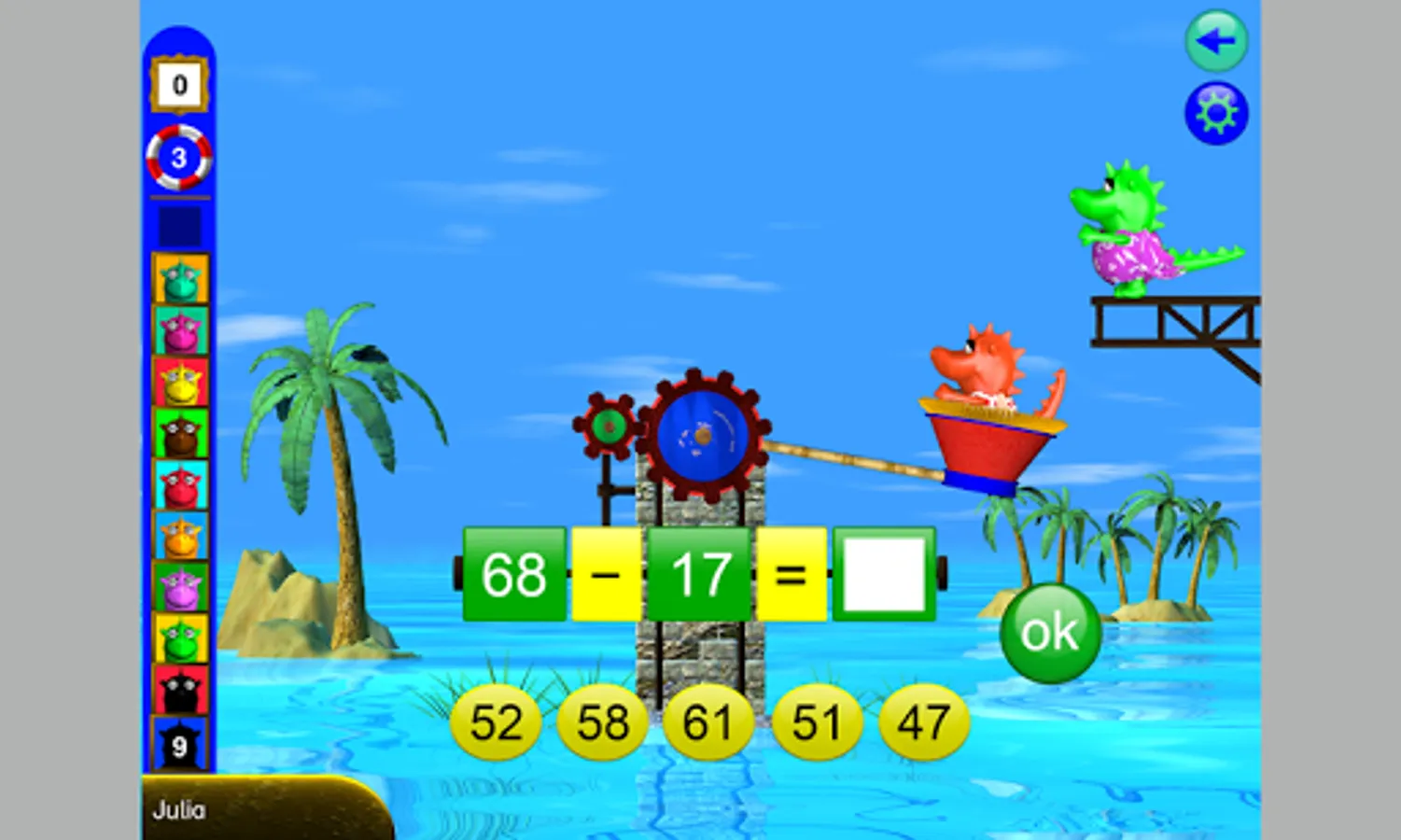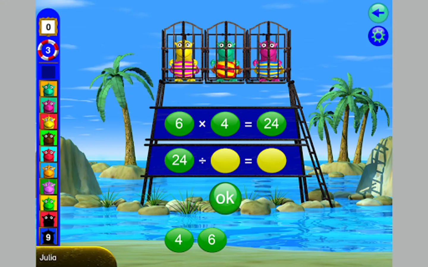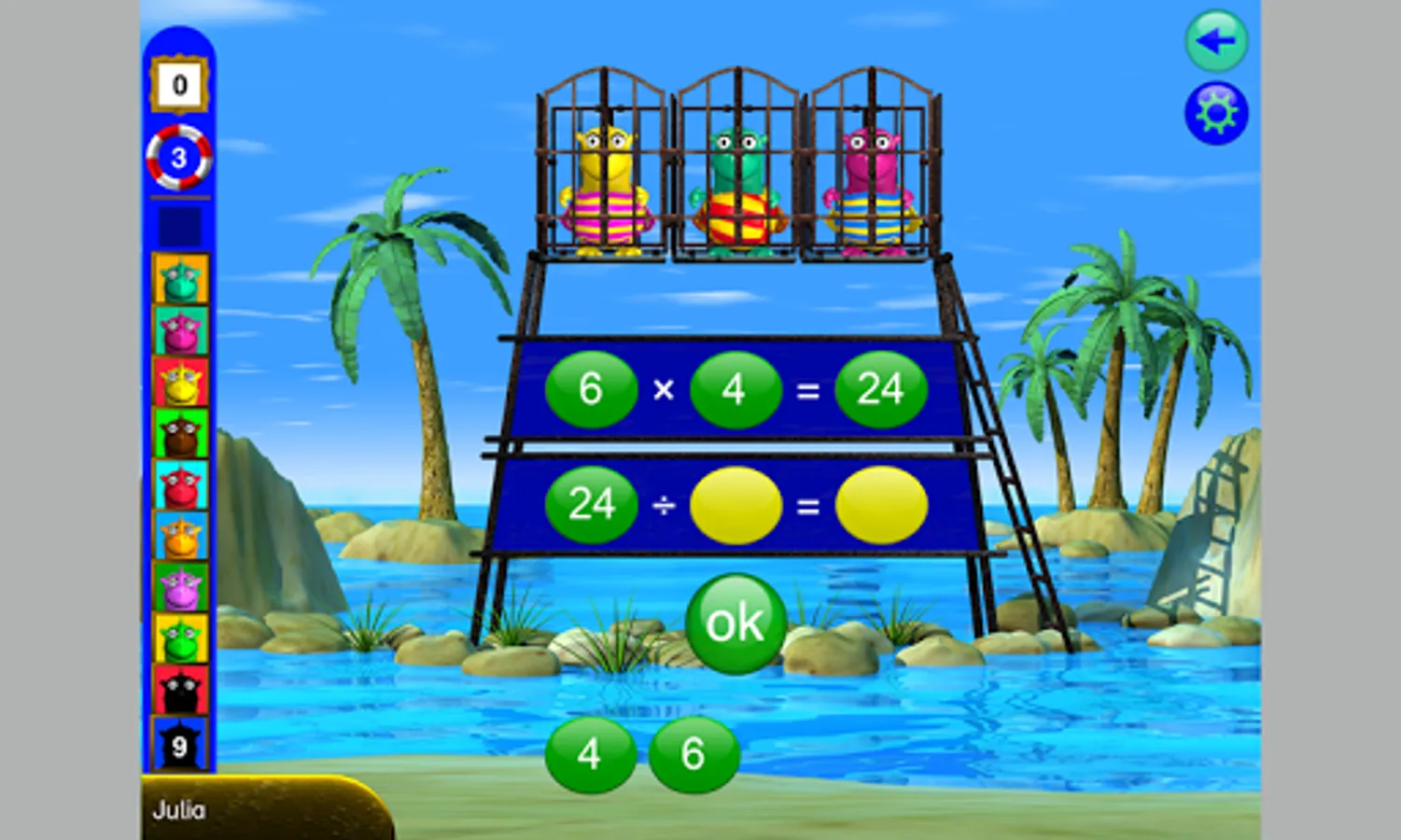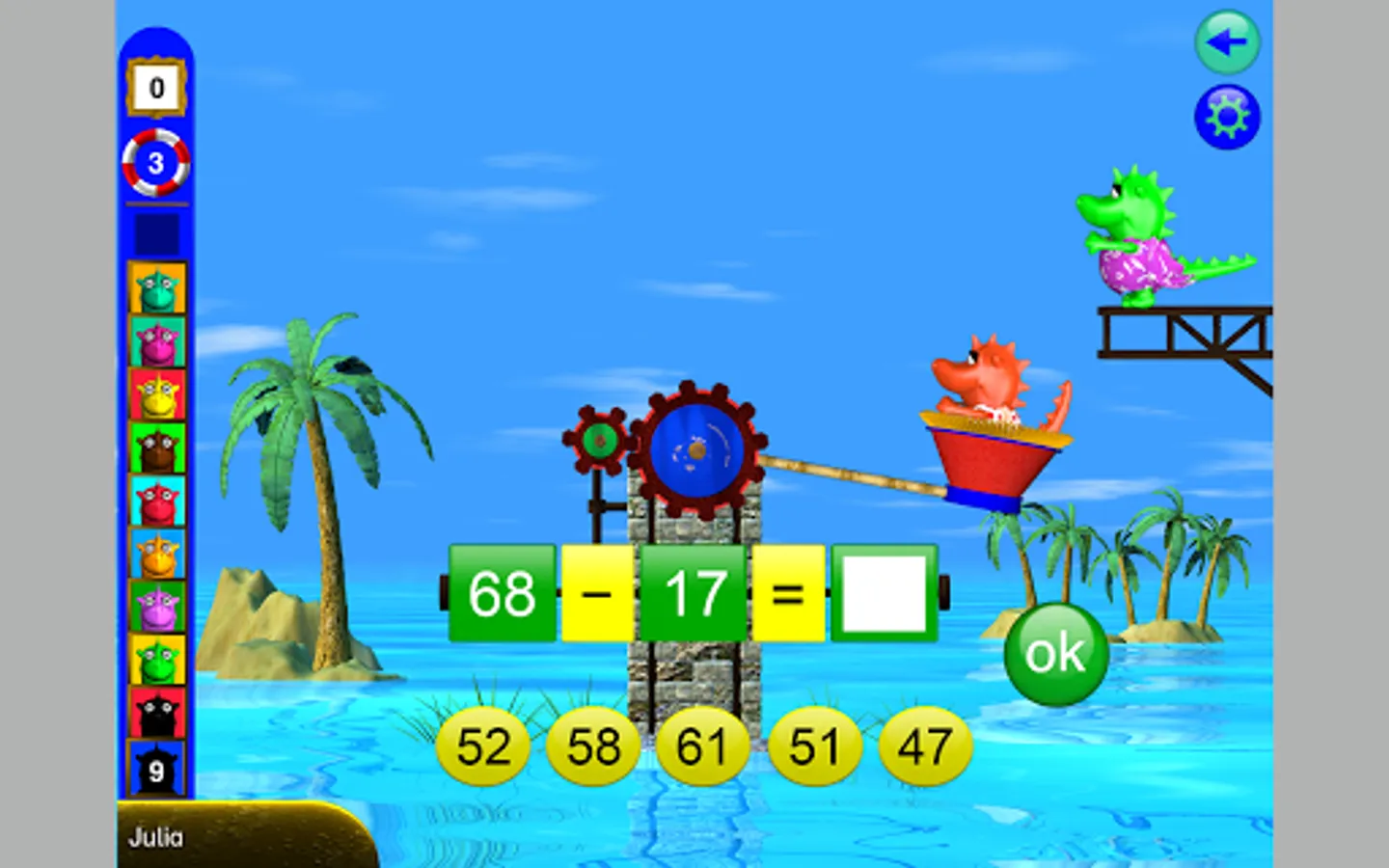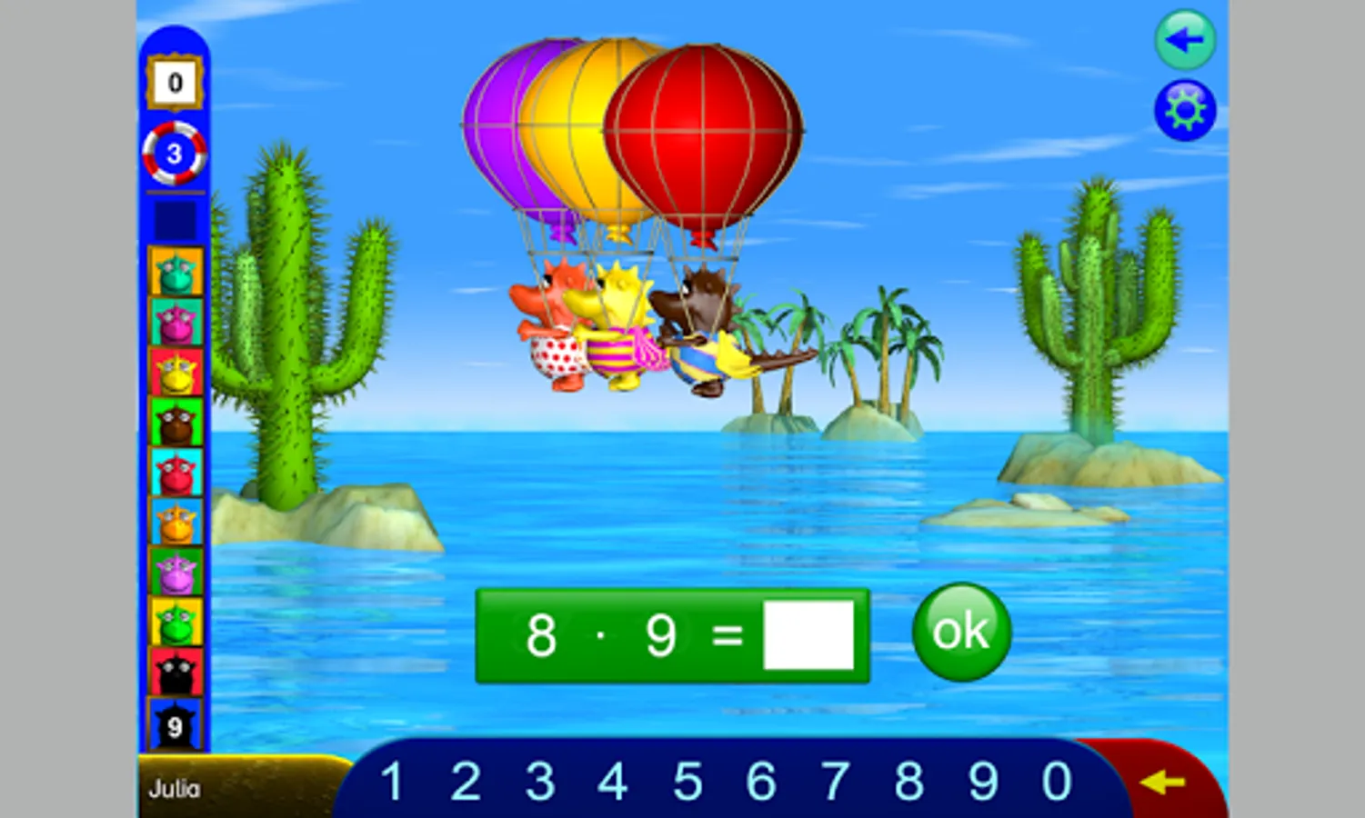 Each player starts off with 3 lifebelts. They are automatically used up each time the player makes a mistake. Each player has a second chance and is given the opportunity to correct the math problem alone or can use the lifebelt to get to the solution path – without any hurry. Once a player has saved 10 Drippos, he automatically gets an additional lifebelt.