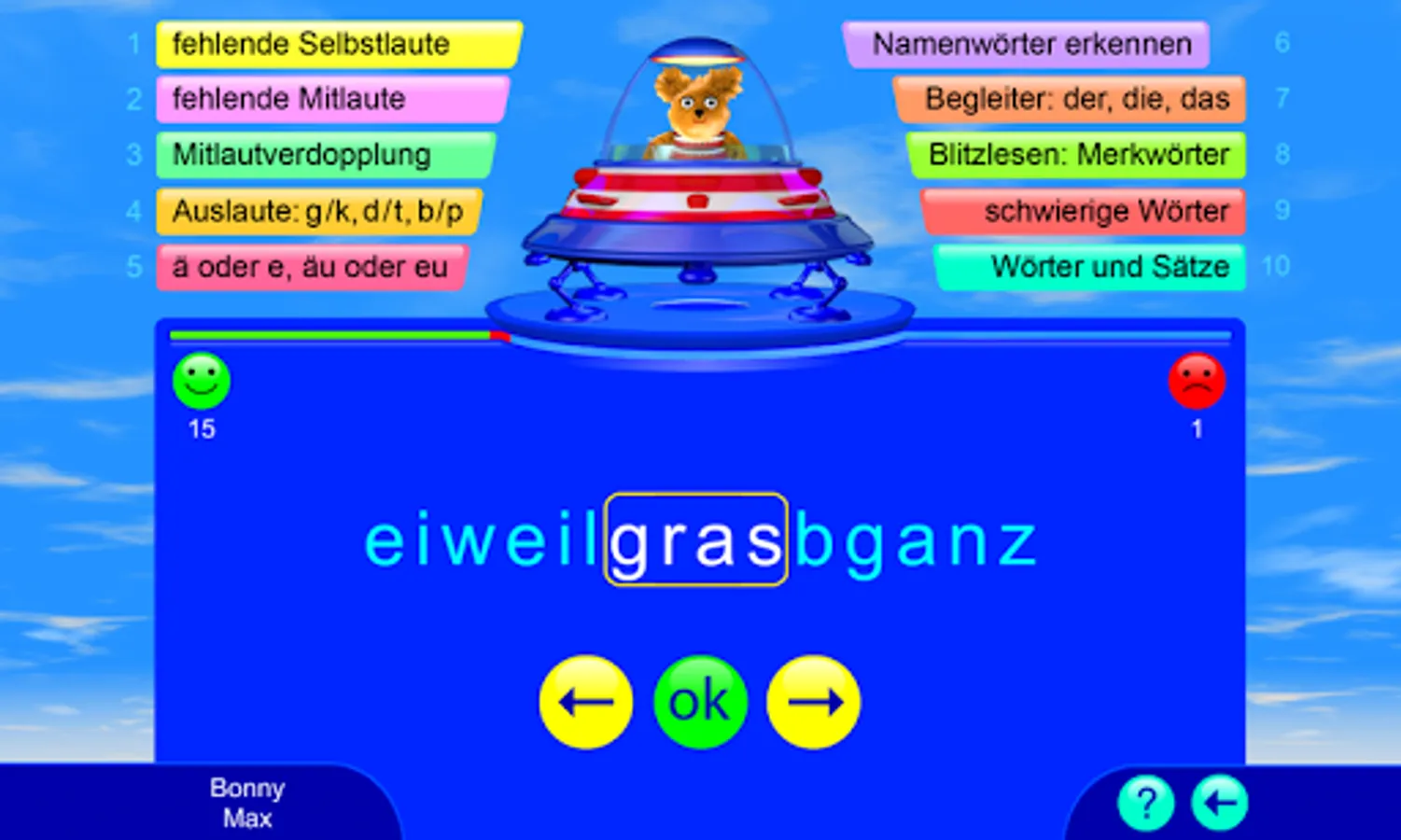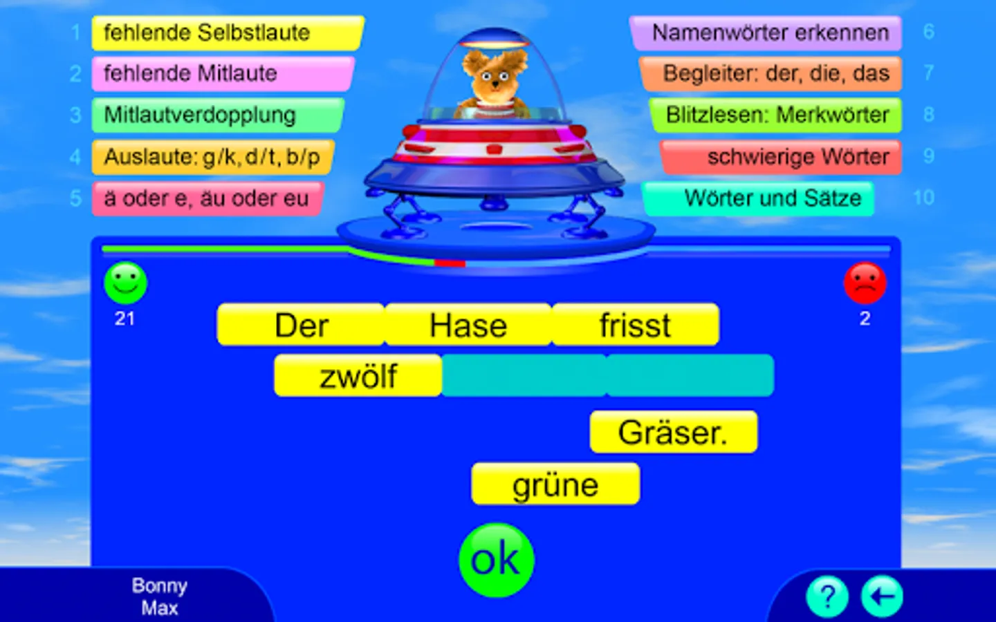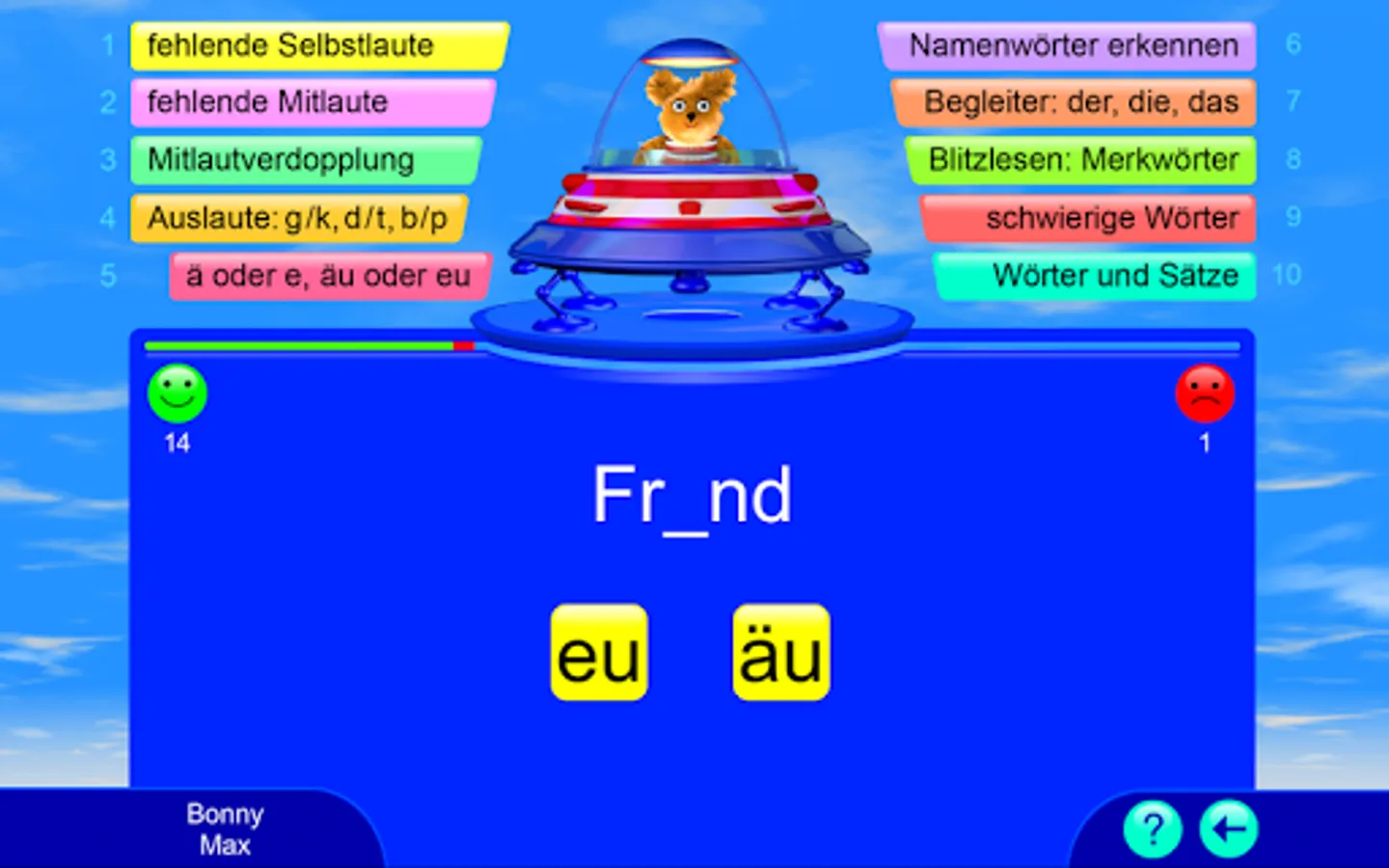 This educational game provides more than 2,000 practice words for sytematically learning German spelling and vocabulary. Everything is read aloud. The players get an immediate feedback on whether the task was solved correctly or incorrectly. If an error occurs the correct solution is shown automatically, helping the player to discover recurring patterns and rules.