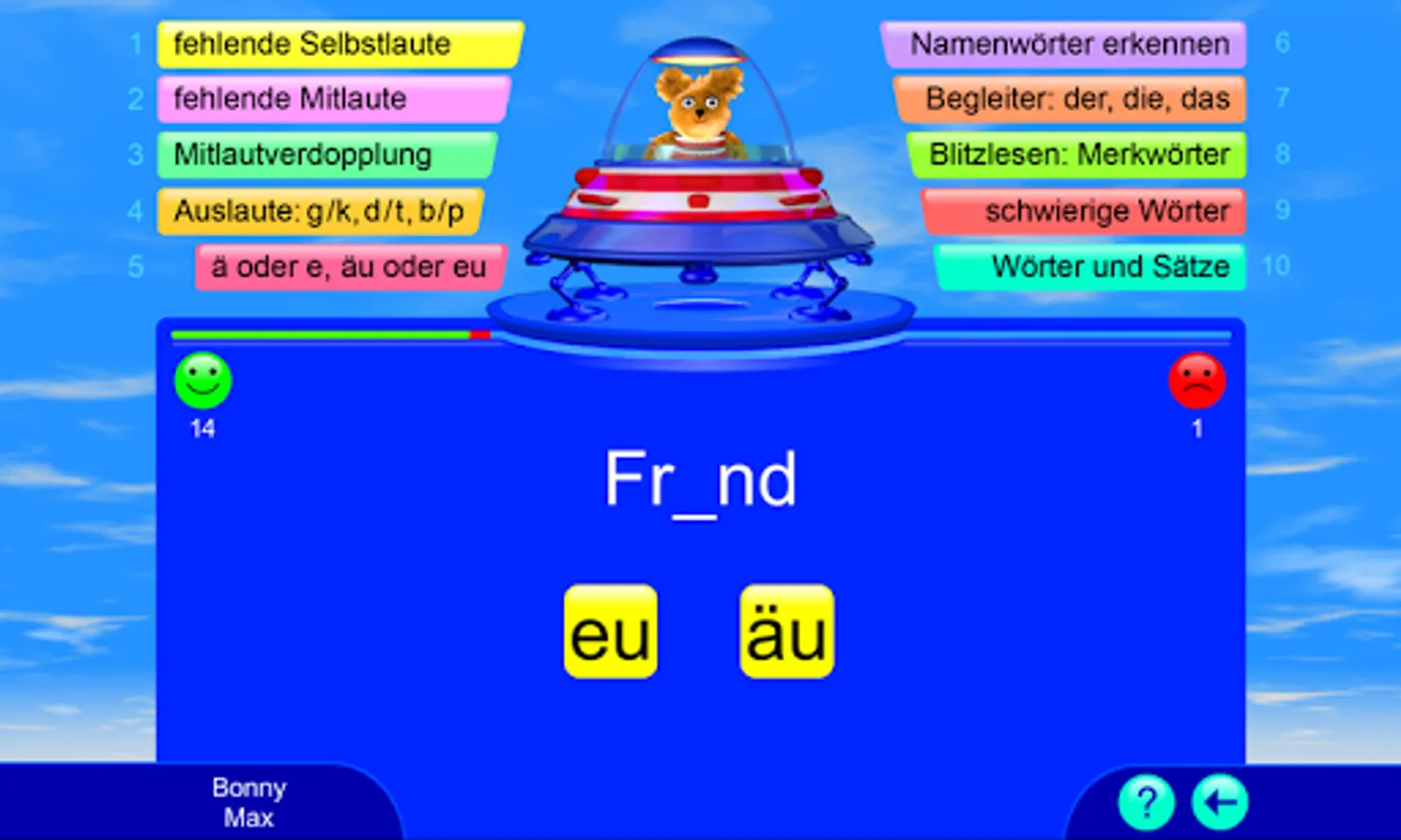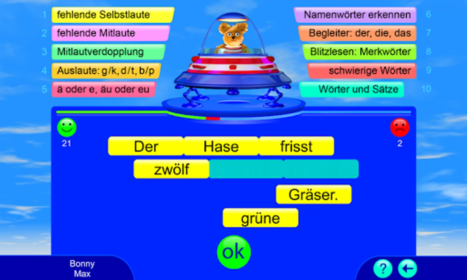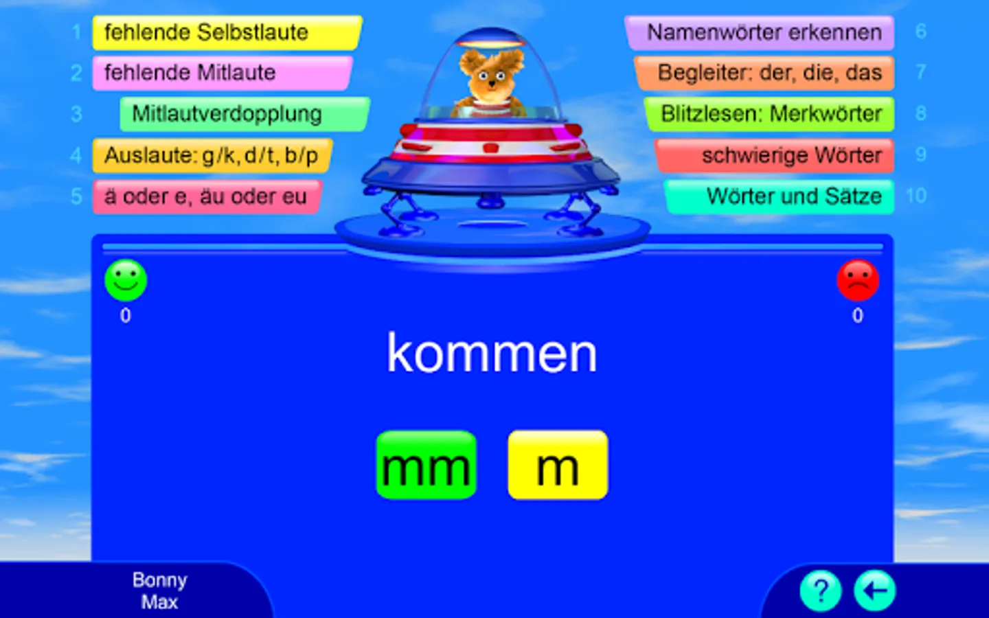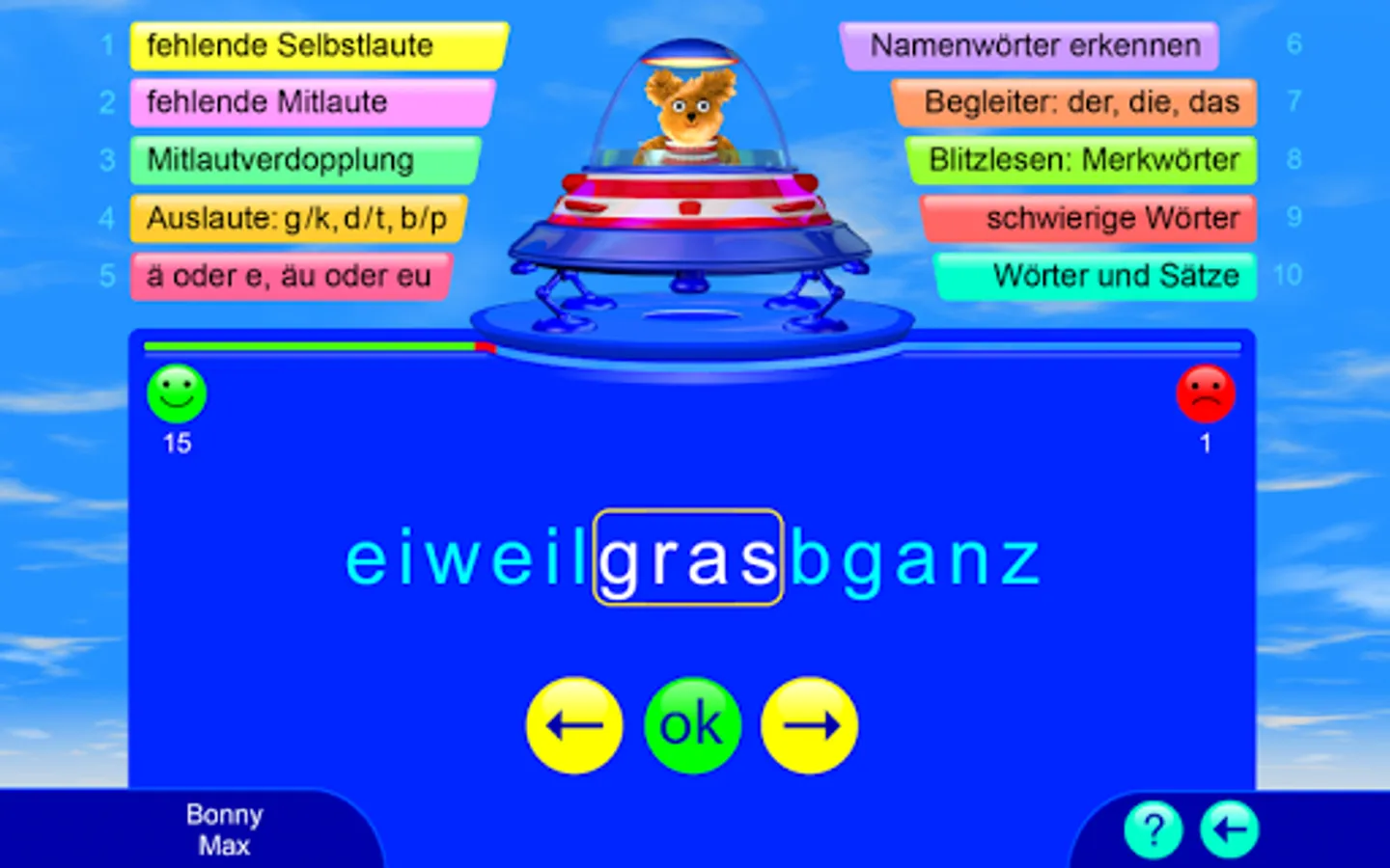 This educational game provides more than 2,000 practice words for sytematically learning German spelling and vocabulary. Everything is read aloud. The players get an immediate feedback on whether the task was solved correctly or incorrectly. If an error occurs the correct solution is shown automatically, helping the player to discover recurring patterns and rules.