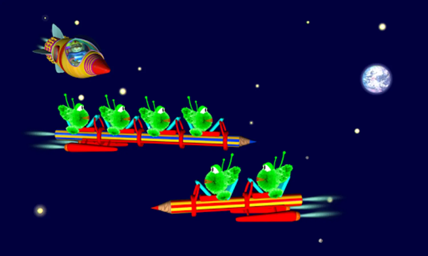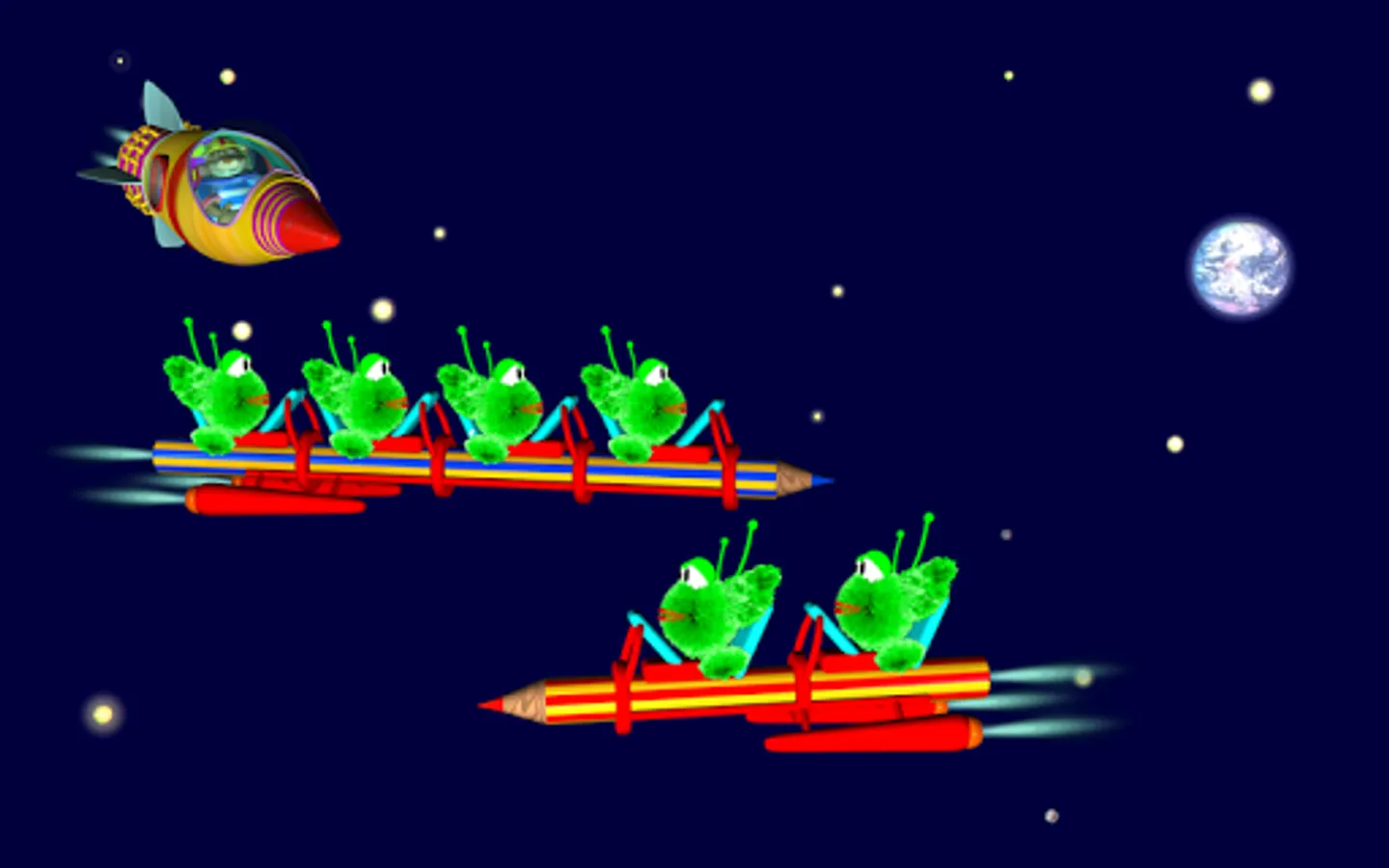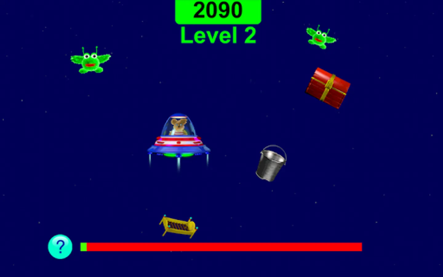 After 50 correct answers, the space journey begins. While trying to save as many Alphis as possible, the players must also react quickly to avoid collision with floating space junk threatening their space ship.