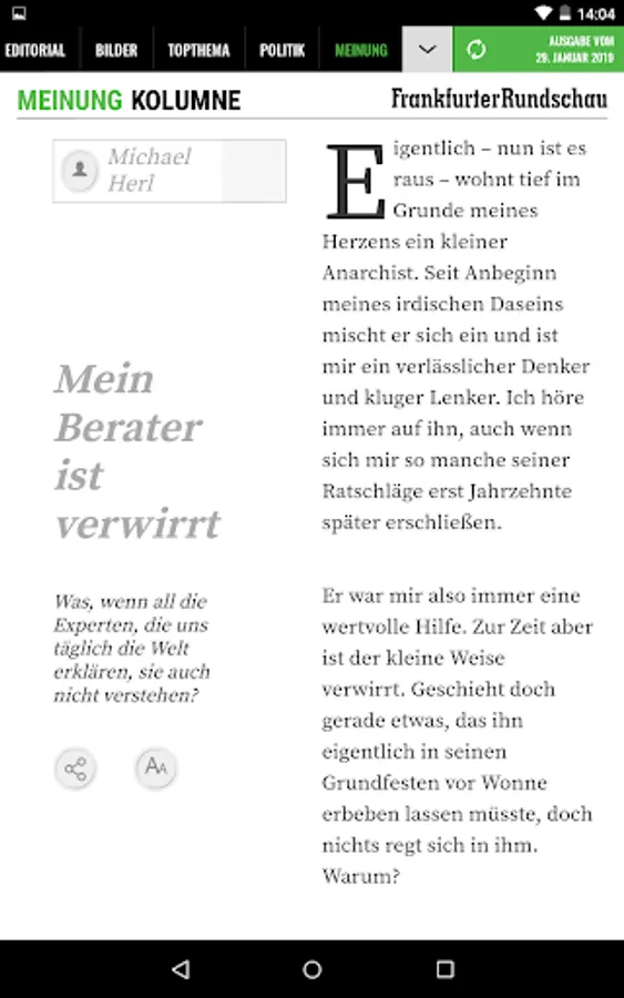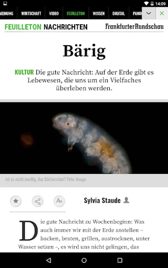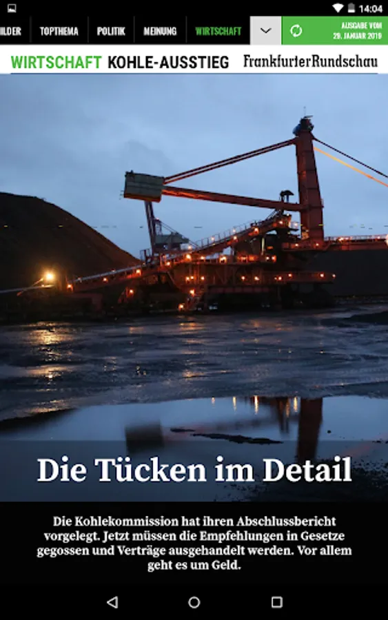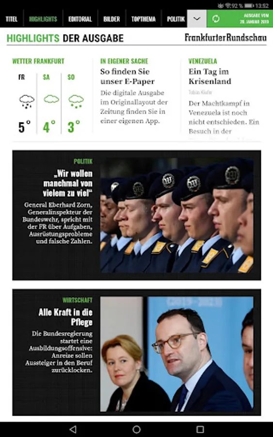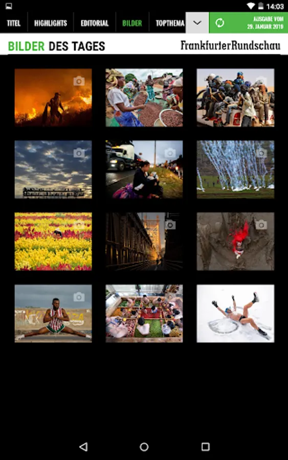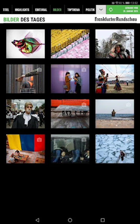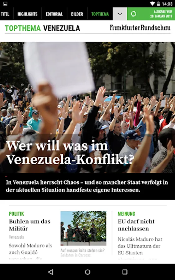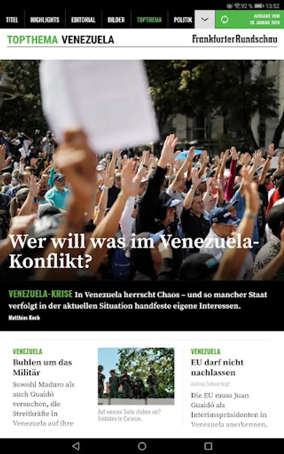 Anyone who reads the best of the Frankfurter Rundschau on their tablet can sit back and enjoy: The front page, which graphically illustrates a topic. The large-format pictures of the day, which come with an exceptional sharpness and color intensity - and therefore appear particularly dynamic and emotional. The reader-friendly layout without annoying advertising banners. The texts, which we supplement with photo galleries, videos, audios and interactive graphics. In addition to our cinema recommendations, also see the video trailer for the film and listen to the music album discussed. Dive deeper into the data behind a story with interactive graphs. And: Test your news knowledge with our news quiz or relax with the daily Sudoku on the tablet.