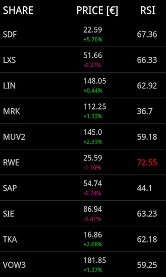 The Frankfurt Stock Analyzer shows a list of stock shares which build a particular index. In addition to closing prices and percentage changes in asset prices, the RSI indicator is presented. The application presents the indicator in a green color when a share is considered to be oversold - that happens when the RSI reading falls below 30. Conversely, the share is overbought when the RSI rises above 70.