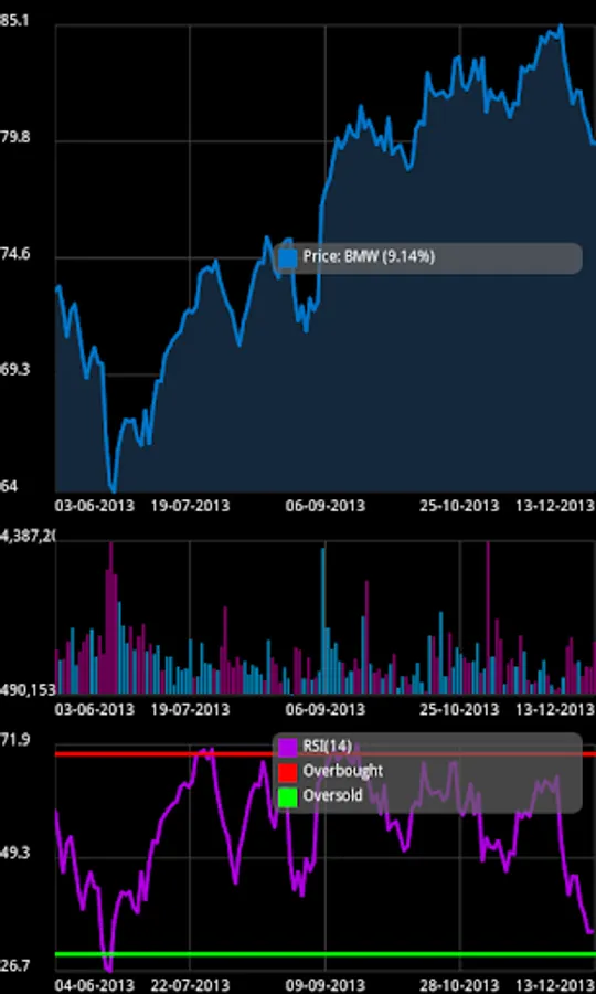 Selecting a stock from the list of shares, user goes to the history module where the history of price change and its RSI indicator are presented. The application allows to check the history in various intervals. Additionally, you can use a Pinch-Zoom method which is very helpful in a non-standard intervals.