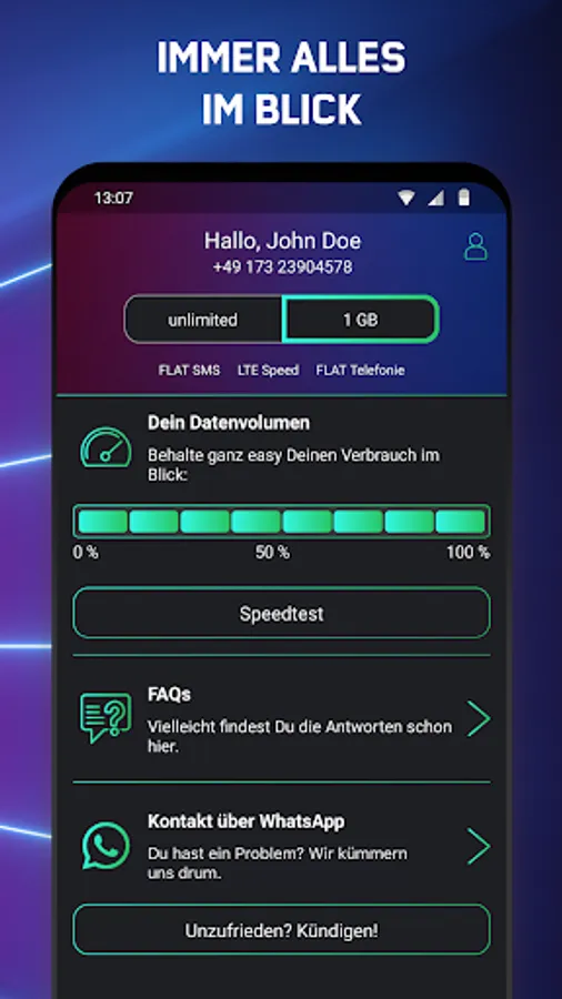 • Transparency: Everything in one app. Check your data volume used and who you called on the phone every day. Your costs? You can also find it in the app.