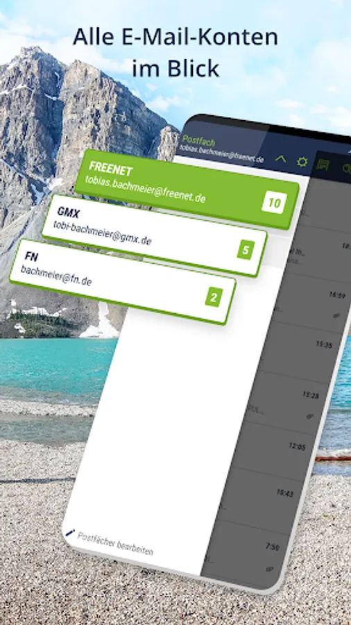 - Use multiple e-mail accounts in one app - add addresses from other email providers such as add web.de, gmx.de and google
