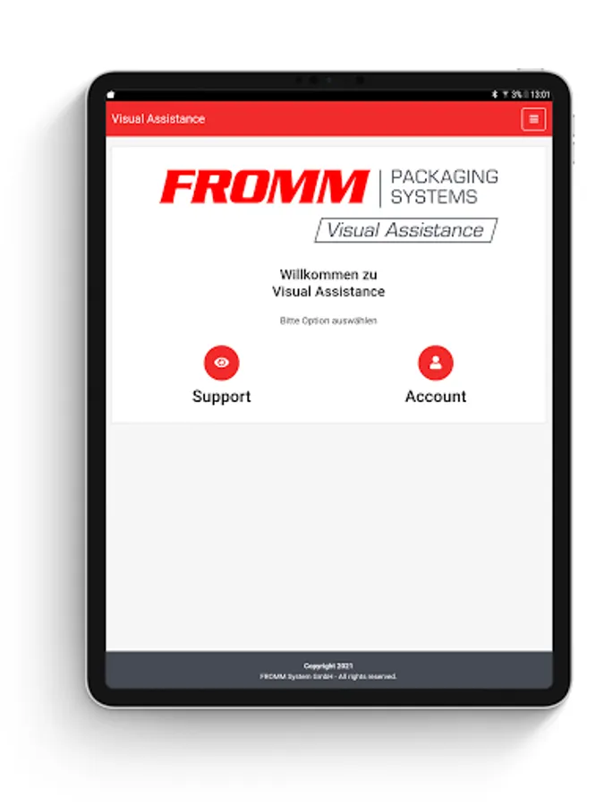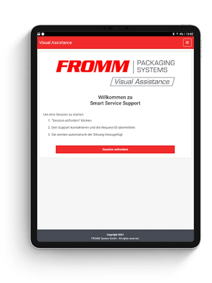 This App is part of the Global FROMM Lifecycle Care Service Program for all FROMM products. The Visual Assistance Service App offers your (service) employees the opportunity for personal, fast, efficient and educational live audiovisual support by a FROMM specialist, during their installation, maintenance, service work or training of FROMM products. Live images of the object can be exchanged, deviations shown and technical literature and advice offered via a direct internet connection. For this you can use a Smartphone, a Tablet or the hands-free solution with Smart Glasses. In this way of rapid exchange of information, a diagnosis can be made in a short time, questions answered, decisions taken and a possible follow-up action planned. This saves valuable (travel) time and questions about faults and settings can be handled quickly and efficiently. When using Smart Glasses, mechanics have their hands free and can simultaneously perform actions where the FROMM Specialist watches live and can possibly give directions. In consultation with your employee, the FROMM Specialist can decide to make recordings for consultation or training purposes.