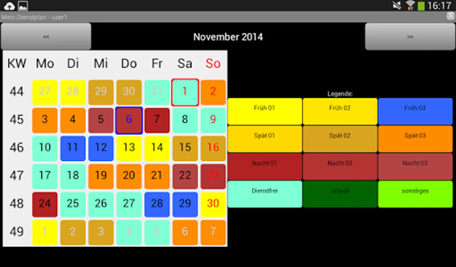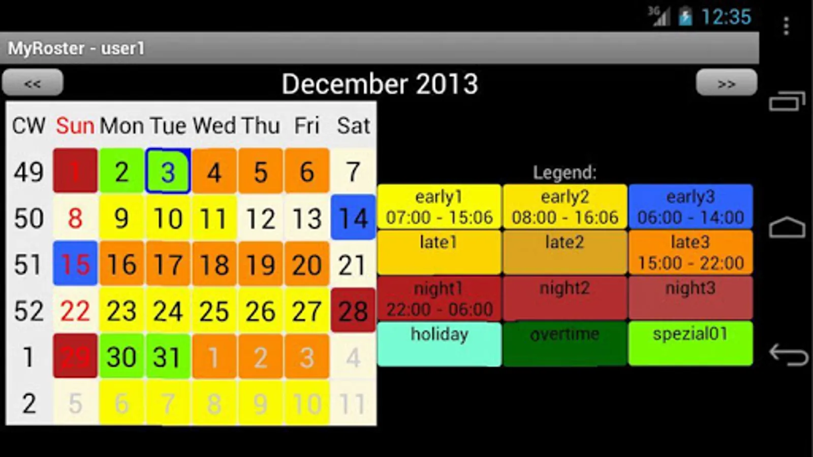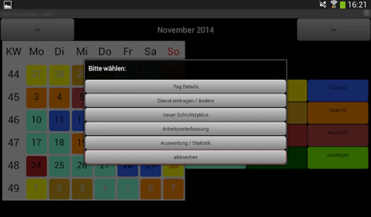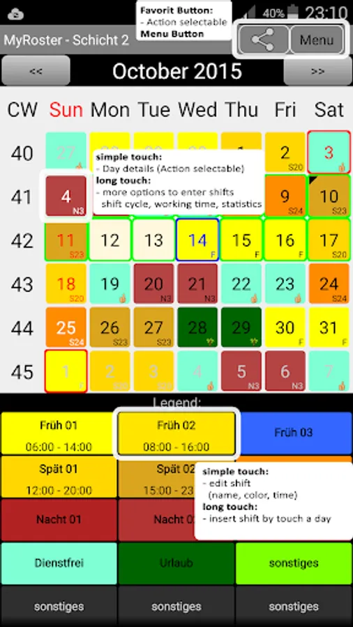 - Possibility to input of shift cycles. eg: F, F, S , S, N , N,... Long click on a day ( submenu)