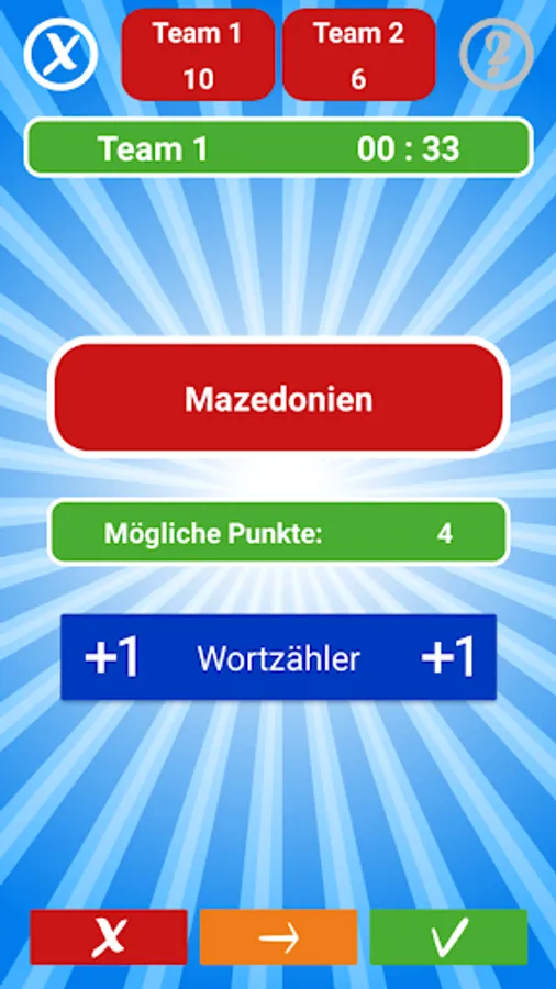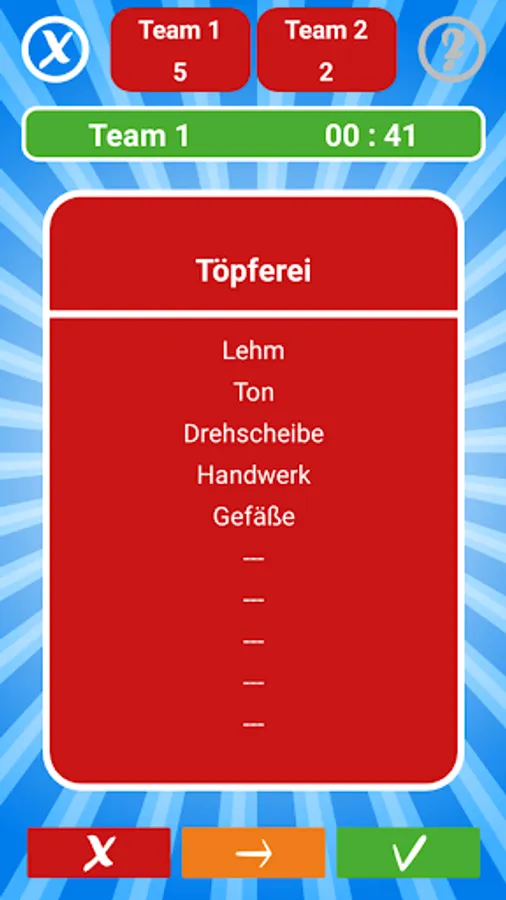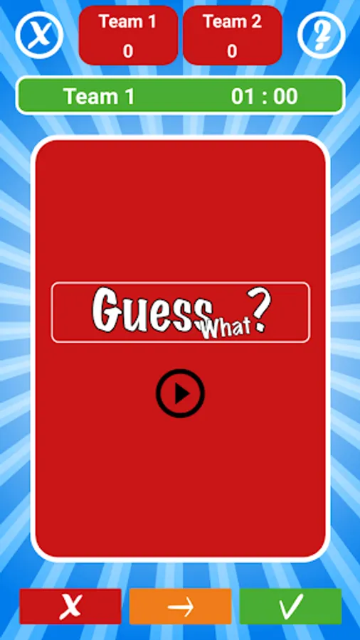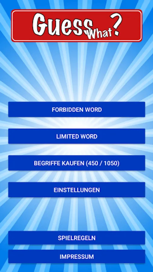 Guess What is based on several classic party game. The active player tries to convey as many terms as possible within a given time disastrous appearance. This can happen if paper and pencil at hand by explaining, difficulty explaining, charades (pantomime) or by drawing. For the difficult explaining there are different levels of difficulty (1-10 prohibited term) in order to adjust the claim unclear for each round from young to old can. The lap time is also variable. With some additional equipment you can even simulate the television classics Ruck Zuck.