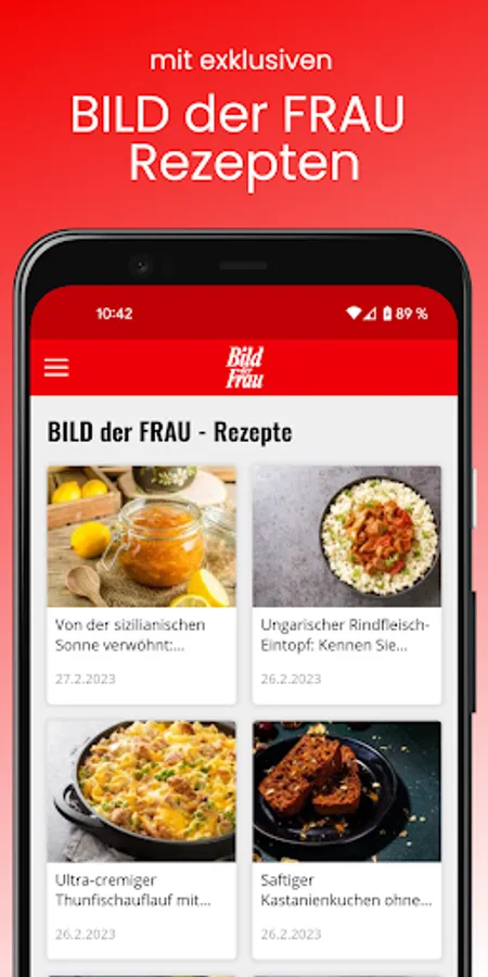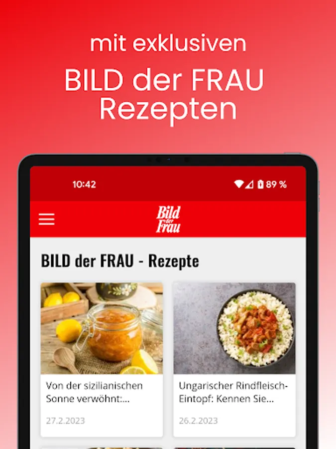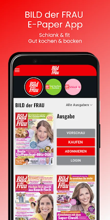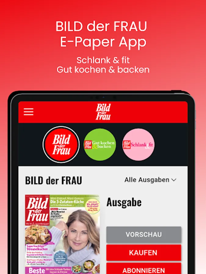 BILD der FRAU stands for a varied mix of all the topics that move women! You can download this app for free and then either subscribe to the digital editions of BILD der FRAU, BILD der FRAU "Schlank & fit" and BILD der FRAU "Gutkochen & Backen" or buy individual issues.