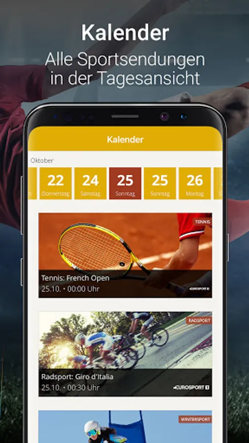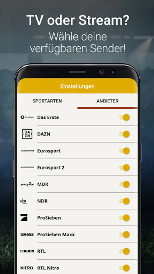 You can personalize your sports program in no time. Simply click on Settings and choose what interests you under Sports and Provider . For sports we offer football, tennis, motor sports, golf, cycling, winter sports, handball, basketball and volleyball. Under Provider you will find DAZN, Das Erste, ZDF, WDR, MDR, NDR, SWR, RTL, RTL Nitro, Sat1, Pro7, Prosieben Maxx, Eurosport, Eurosport 2, Sport1, Sportdigital and Sky Ticket.