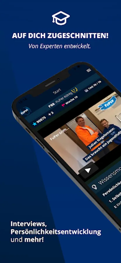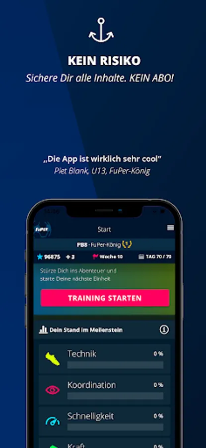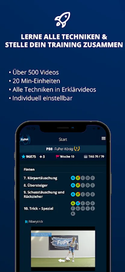 Start our 70-day program and improve your skills in a targeted manner in the areas of technique, strength, coordination, speed and goalkeeping. Stay disciplined on the ball and increase your score after every workout. Motivate yourself and increase your rank and go from being a spectator to a diamond in the rough to a FuPer king.