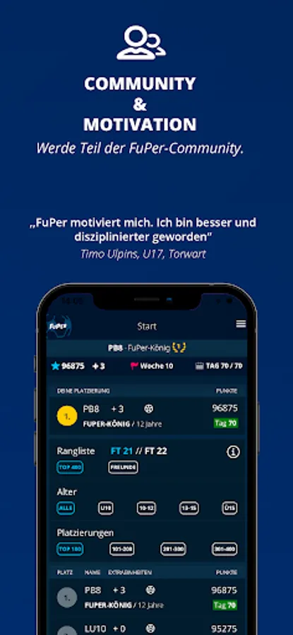 You can become part of the FuPer community and compete with other players. Raise your rank and climb to the top in the highscore. You can compare yourself to other users on the ranking list in the app on a daily basis and motivate yourself.