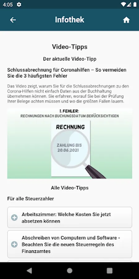 The app provides information on new regulations, information on tax deadlines and explains the GoBD with the help of short instructional videos simple and easy. This creates clarity and transparency.