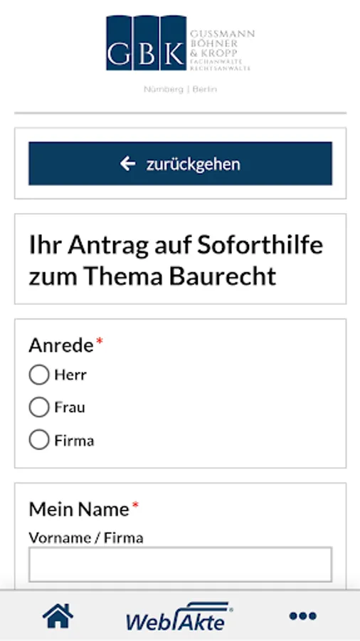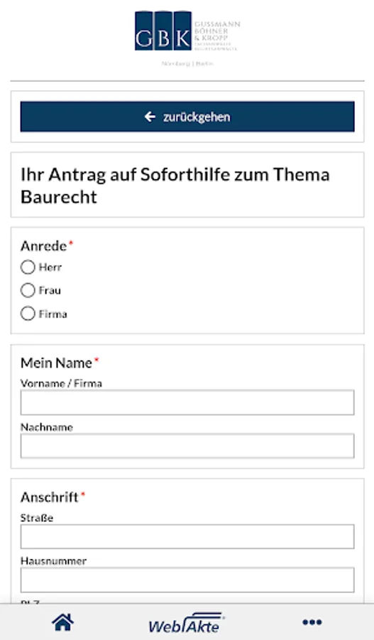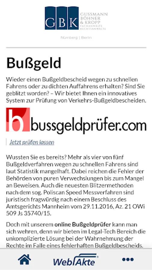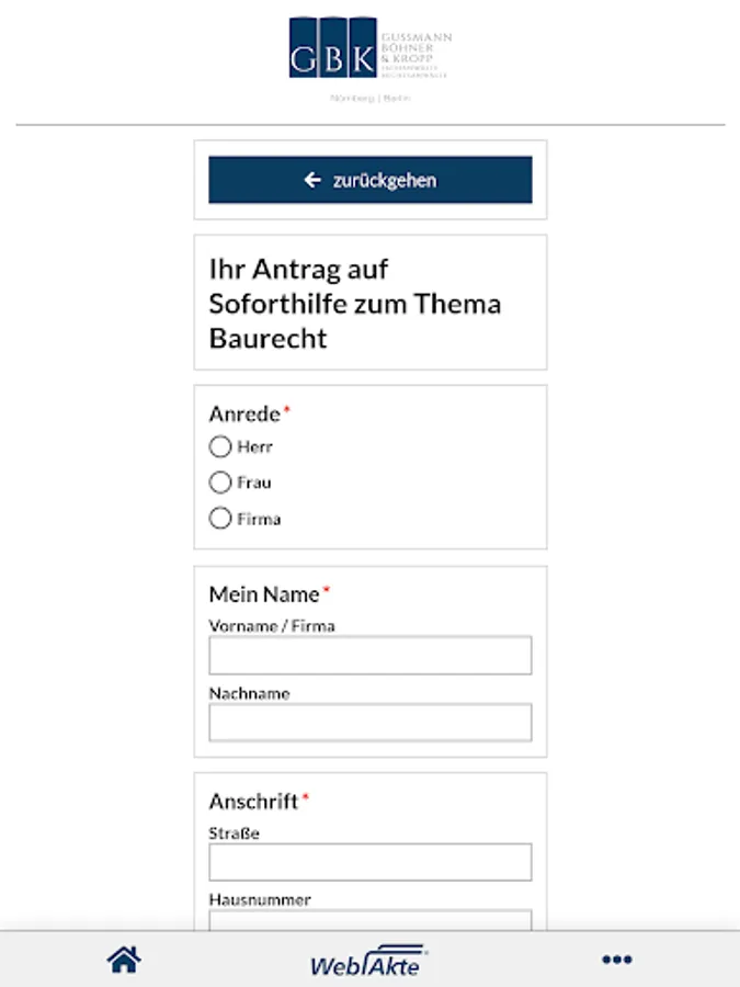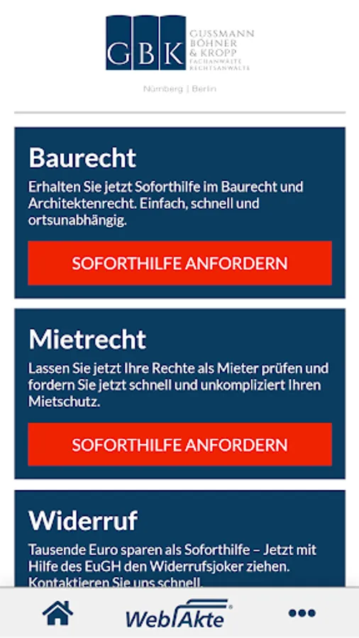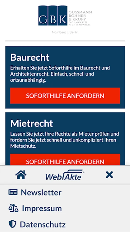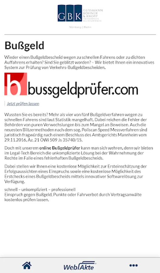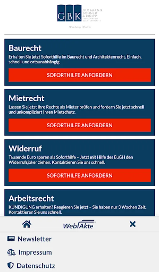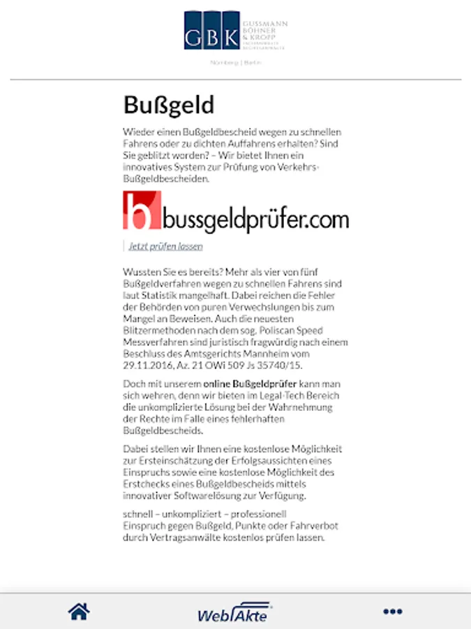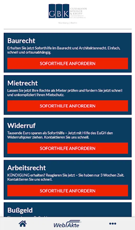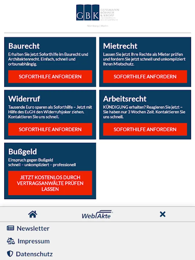 The online service from /// GBK LEGAL is the portal for emergency aid in the areas of employment law, banking law, building law, tenancy law and the examination of administrative fines. Information and orders are made online in just a few minutes.