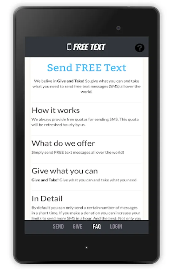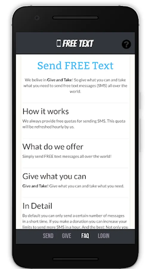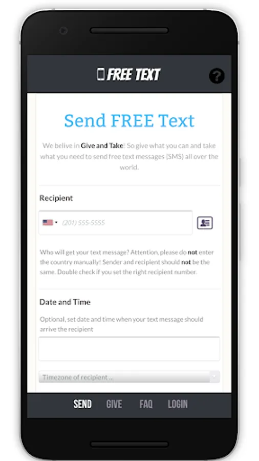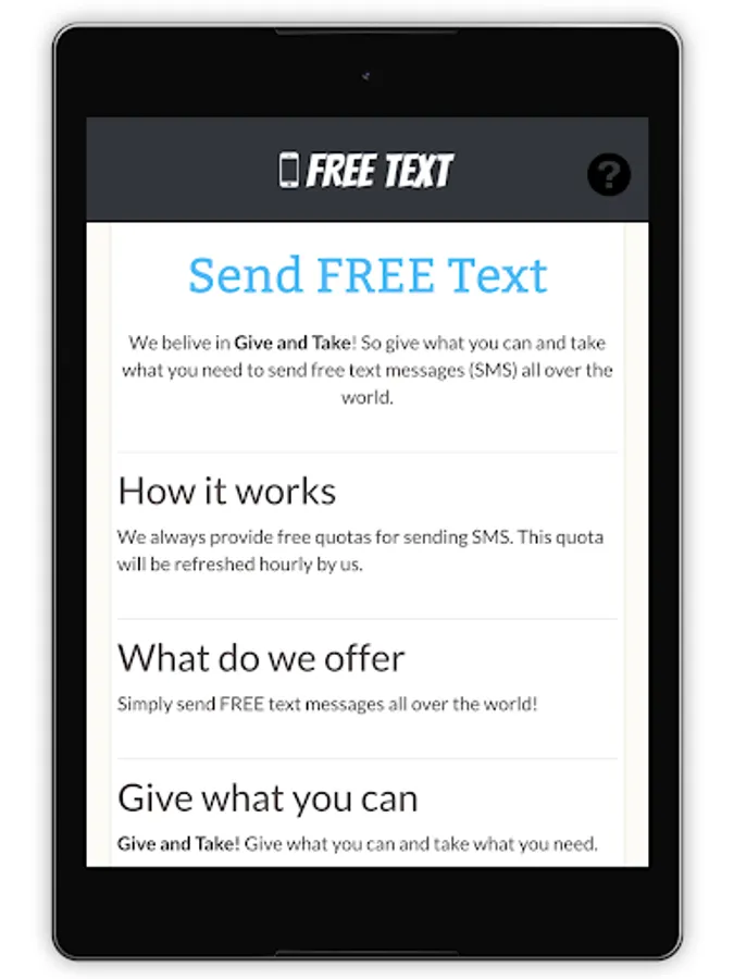 We belive in Give and Take! So give what you can and take what you need to send free text messages (SMS) all over the world.