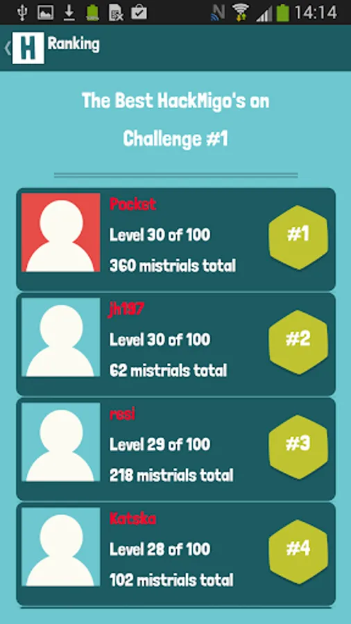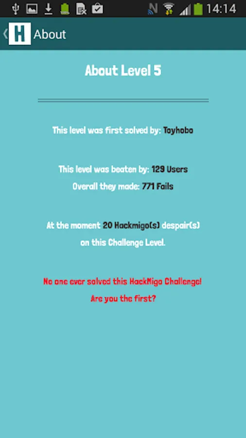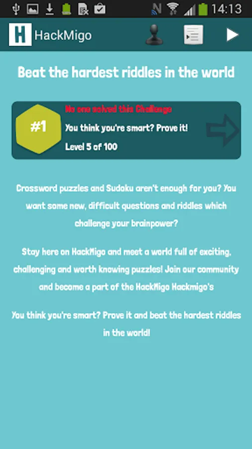 HackMigo is an interactive puzzle community. There are challenges, which will be created by the operators in irregular gaps. The riddles can't be simple solved with Google or Wiki. So think around the corner and maybe you master the hardest puzzles in the world. Each Challenge have 100 Riddle-Levels. Be smart and clever and reach the top of the rankings.