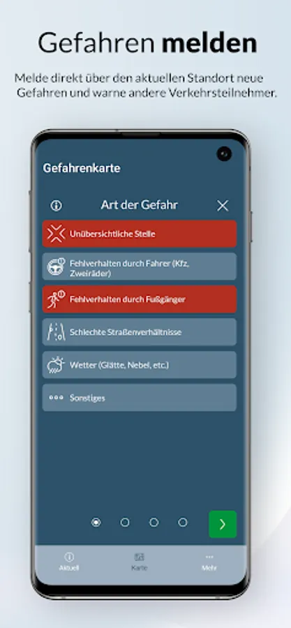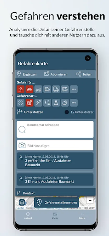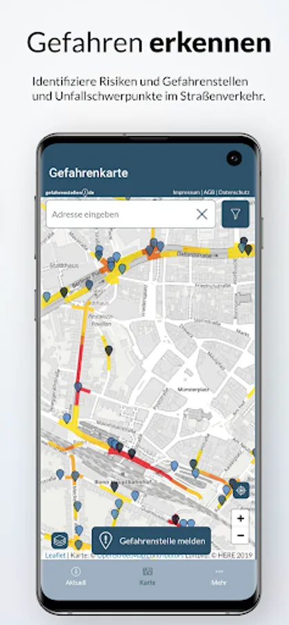 Help to ensure more safety on the road: you can use the app to report dangerous spots yourself, so that the large hazard map is constantly being improved and other road users can also be warned of dangers.