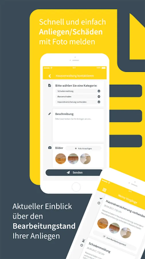 As a tenant or owner, you can report damage or concerns directly with photos via our app. Your inquiries are then available to our employees for processing and can also be forwarded to craft businesses.