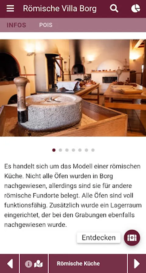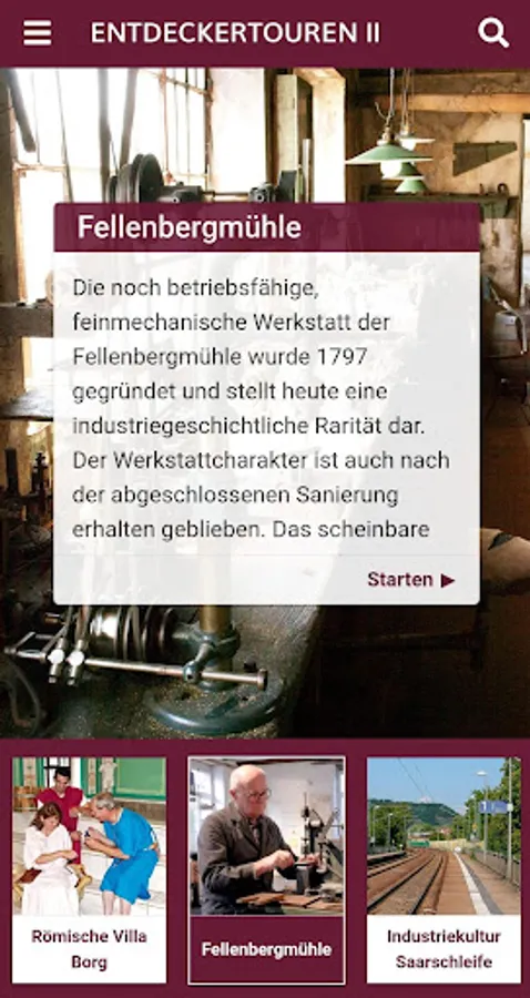 The "Discovery Tours II - the way to the museums" not only leads the hiker past the museum, but also into the museum. The app presents the most beautiful and interesting museum exhibits in images, text and audio. Additional video sequences show the exhibits, such as the machines from the Fellenbergmühle Merzig, in motion. As a contemporary witness, the former apprentice of the precision mill explains how it works. In the Roman Villa Borg, the slave Jatros takes the visitor into the world of everyday Roman life.