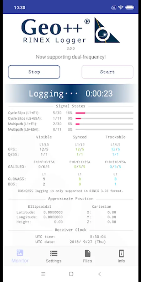 Geo++ RINEX Logger uses the most recent Android API services to log your device's raw GNSS measurement data into a RINEX file including pseudoranges, accumulated delta ranges, doppler frequencies and noise values. So far, it supports GPS/GLONASS/GALILEO/BDS/QZSS for L1/L5/E1B/E1C/E5A (as supported by the device) and has been successfully tested on many devices.