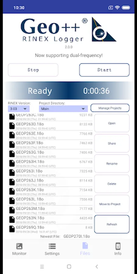 The Geo++ RINEX Logger generates file names according to the current hour and date of year and will append data if the file already exists. If you wish to log separate files within the same hour, please move or rename the most recent file first before you start the next session. The files are stored in the "Geopp_RINEX_Logger" directory inside the root directory of your internal storage.