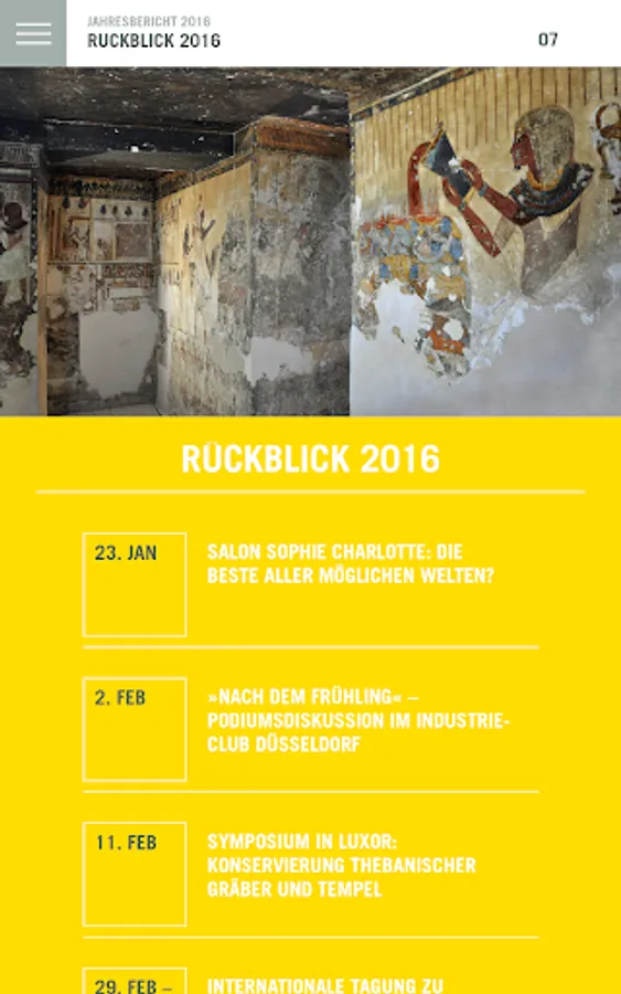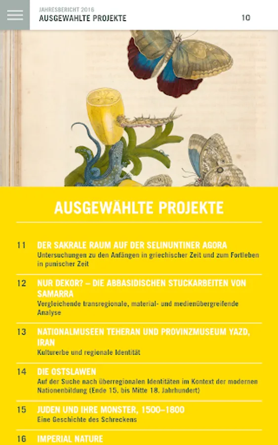 The Gerda Henkel Foundation in Dusseldorf is dedicated to the promotion of science, especially in the field of humanities. The Annual Report 2016 provides information on current programs of the Foundation for the pictures taken during the reporting year in the promotion of projects and completed projects. The app has been extended compared to the print edition 2016 photo galleries, videos, documents and links.