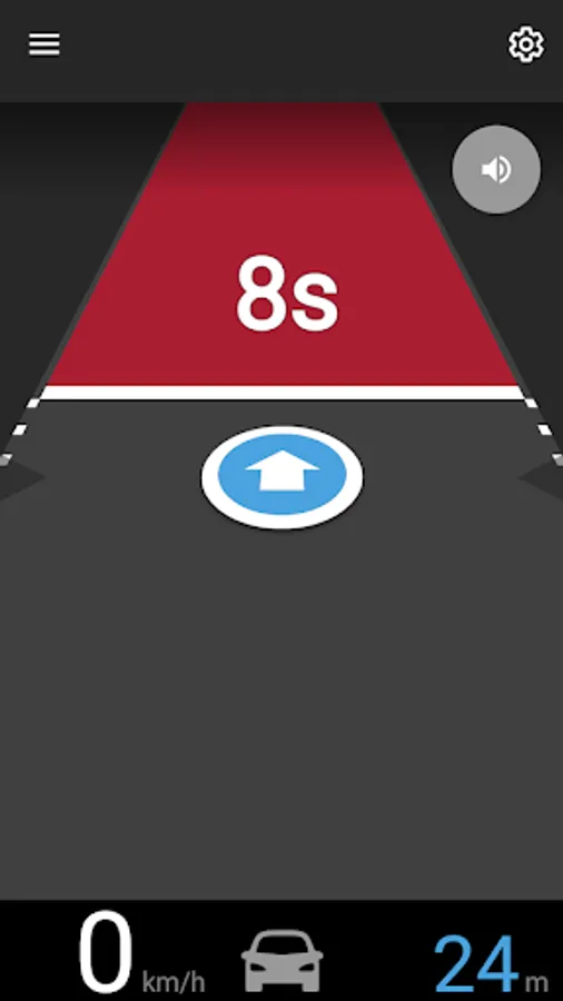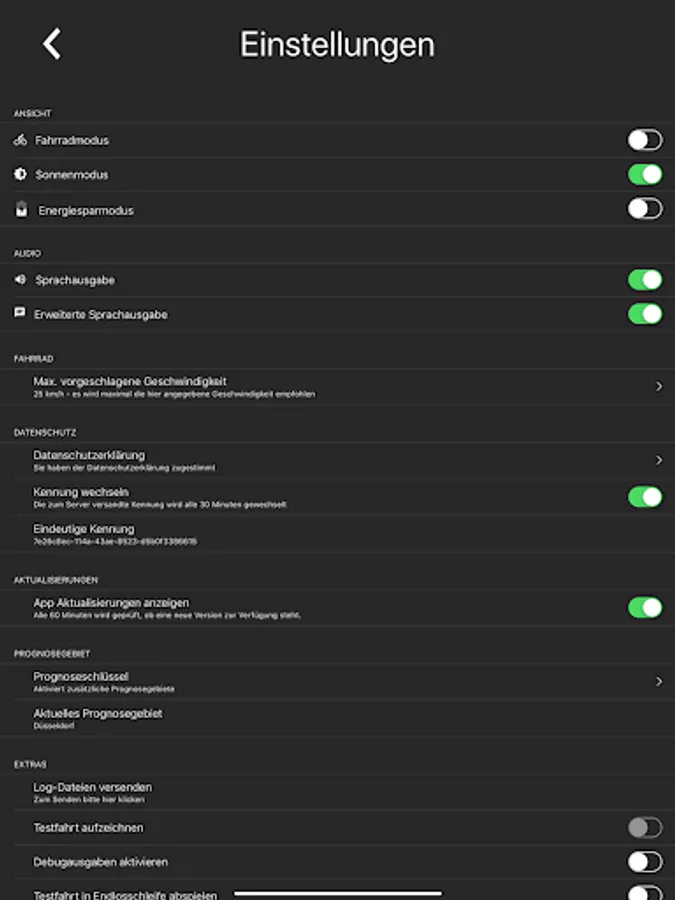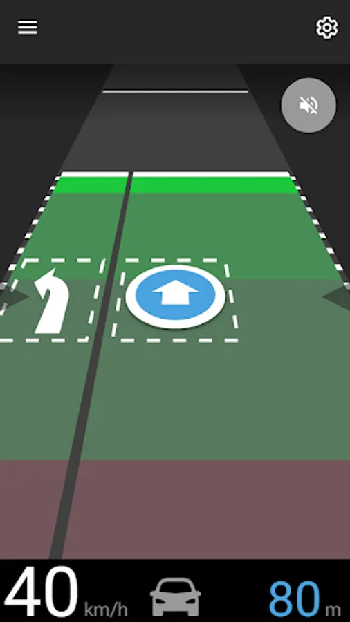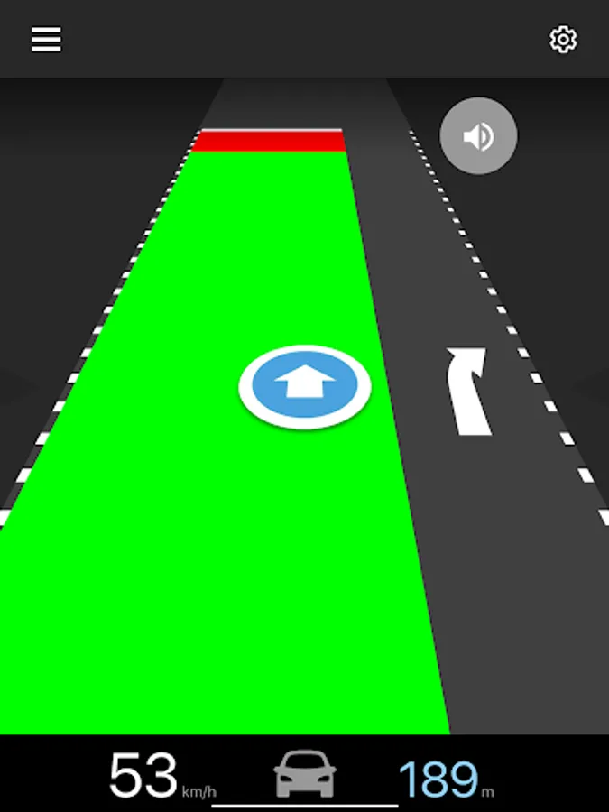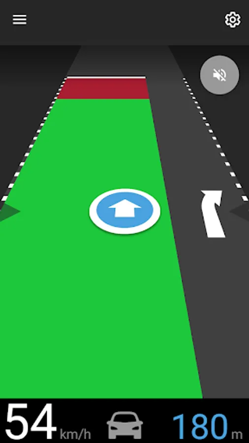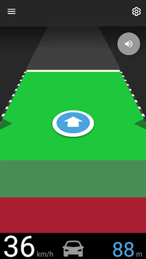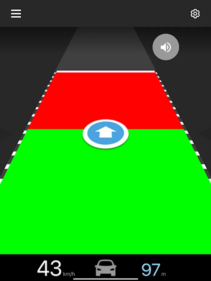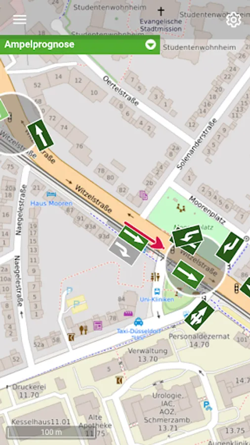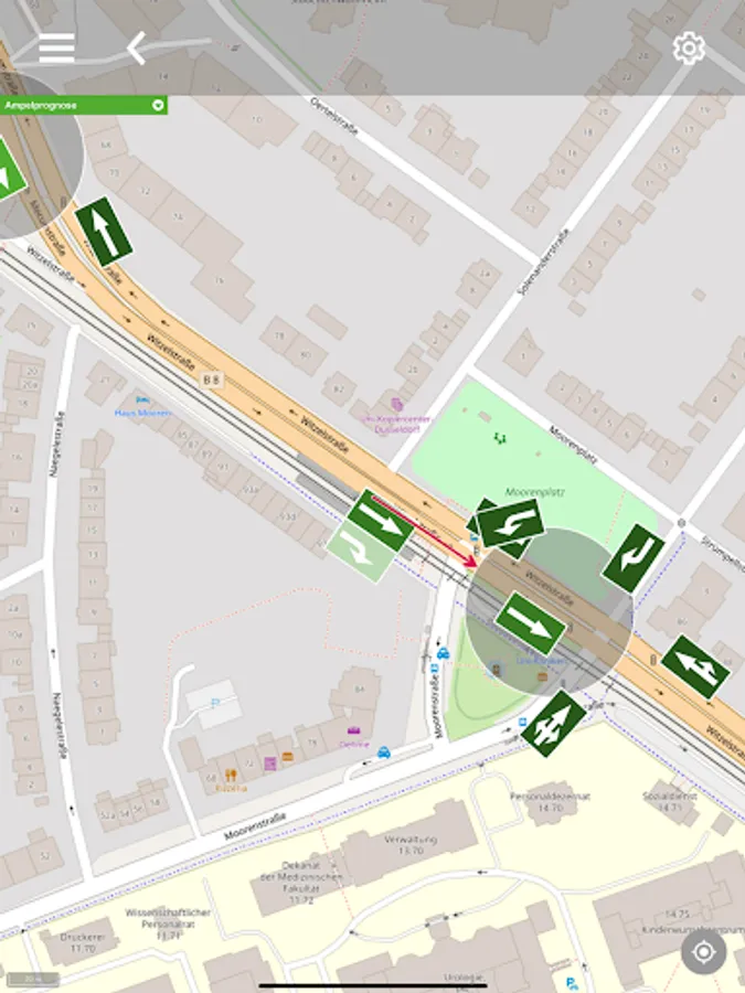 The app uses current position data to display red-green forecasts for the next traffic light. The forecast is laid over the indicated street as a red-green carpet. The color around the central arrow symbol indicates whether the next traffic light will be red or green. The coloring in the upper and lower area is the prognosis, if you would drive a little faster or a little slower.