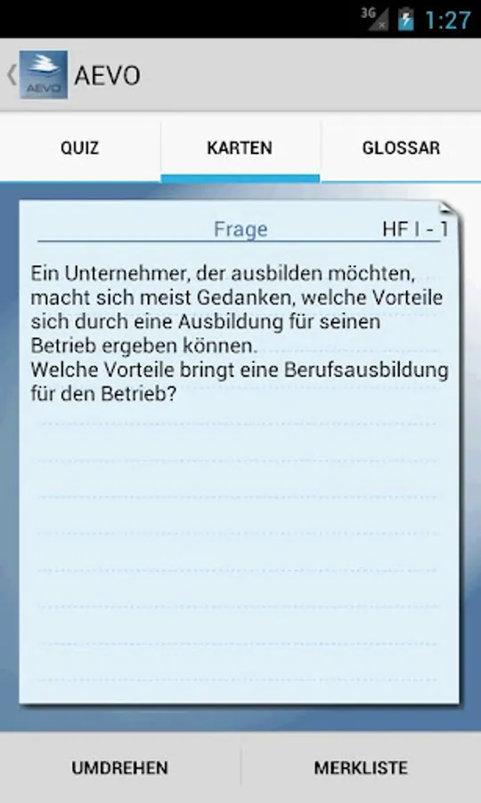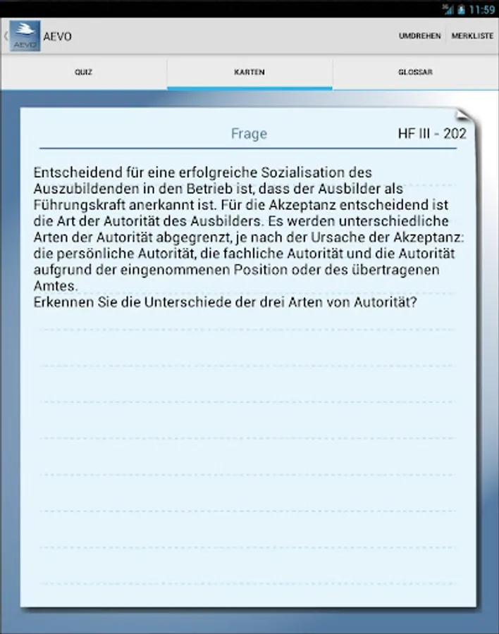 With over 320 digital flashcards, a quiz module with over 220 questions for exam preparation, as well as an extensive Nachschlageregister the app helps you prepare for the aptitude examinations (AEVO).