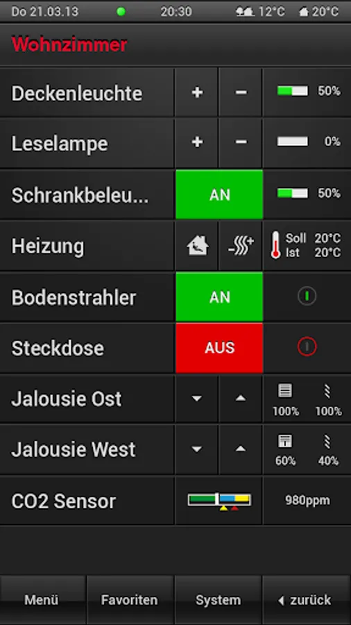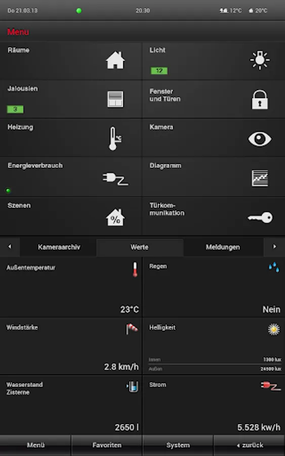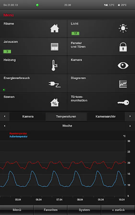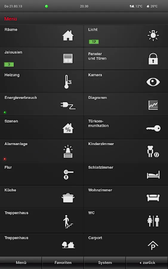 The main menu displays all building functions. Date, time, current temperature and active functions can be viewed via the status bar. The jump back to the main menu is via the lower navigation bar.