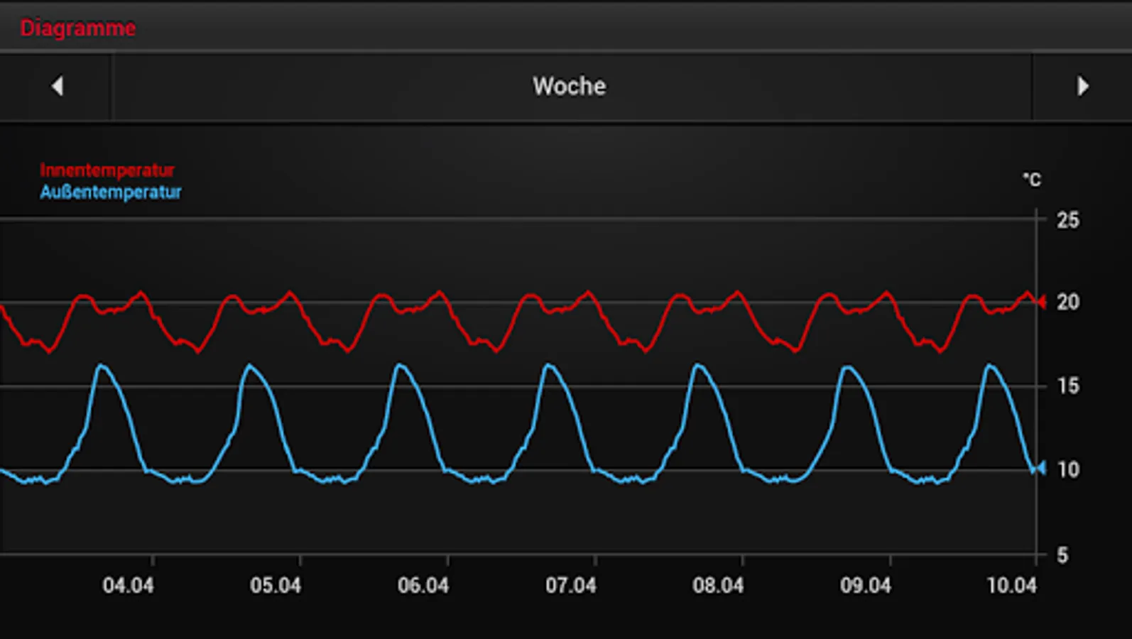 Diagrams enable the clear display of detected and evaluated consumption data by year, month, week, day or hour. If the unit is turned by 90°, the last active diagram appears in the horizontal format. Temperature differences, for example, can be visualised via multi-touch.