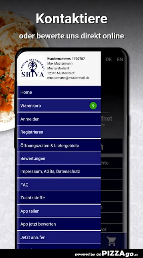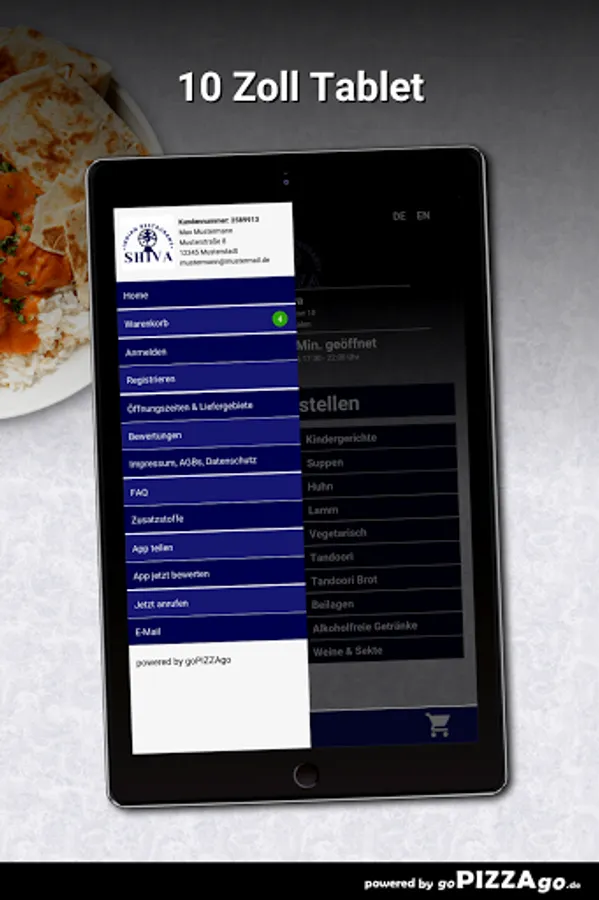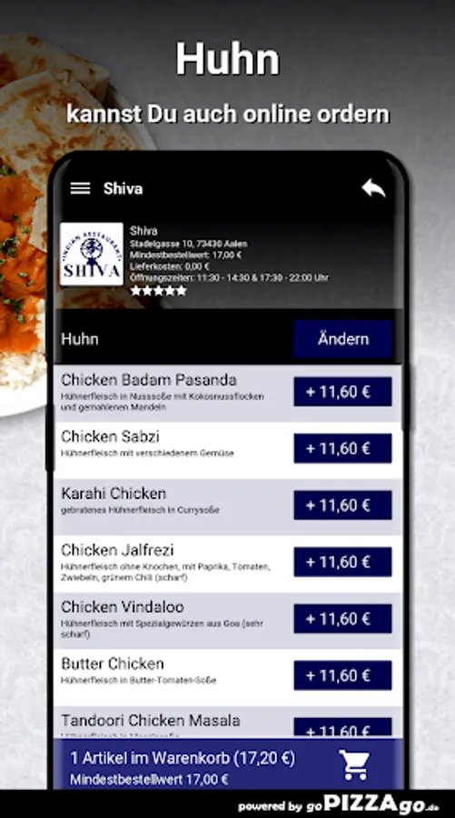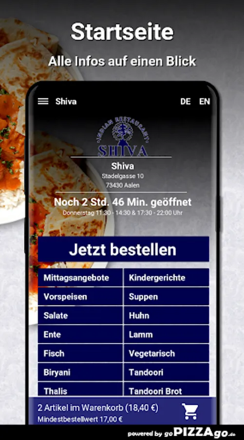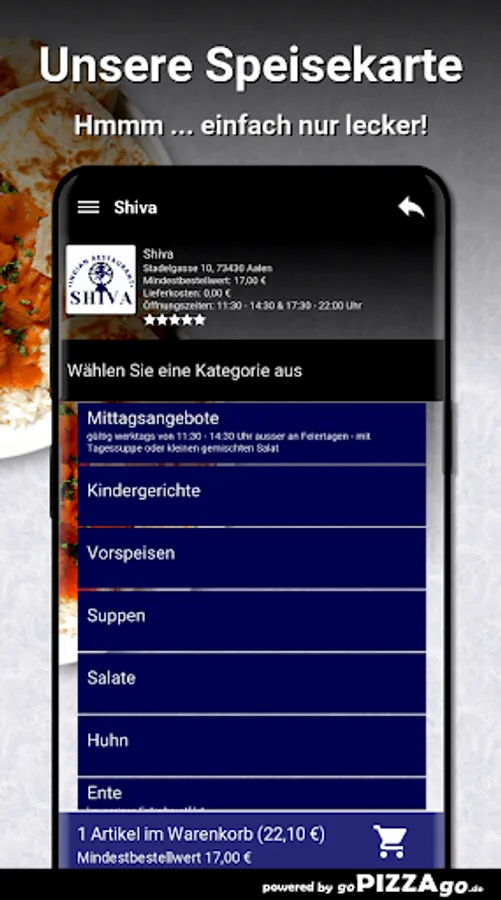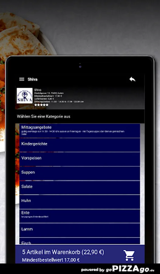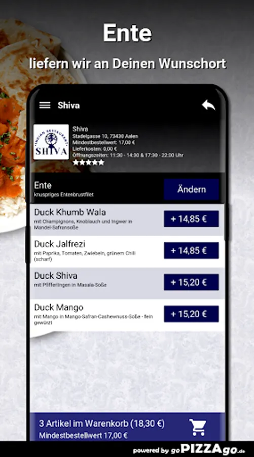 You can order freshly prepared food from our Shiva delivery service here. A very tasty range of 205 meals. We also offer you inexpensive lunch options: Duck Bombay Curry, Garlic Nan, Raita, Chicken Tikka, Mango Lamm, Mutton Do Pyaza, Lunchtime Lamb Curry, Chicken Sabzi. Of course, we also have tasty feasts for the little guests such as the children's menu Mango Chicken with rice for € 6.90, children's menu Malai Kakab with rice for € 6.90, children's menu 6 chicken nuggets for € 6.90, children's menu 6 chicken wings for € 6.90, children's menu French fries for EUR 3.50, children's menu Malai Kakab with marinated chicken breast fillet skewer for EUR 6.90. In addition, you can of course order soft drinks such as Lycheeschorle, Sprite, Mangoschorle, table water, Fanta. These are very happy to order from us. The delivery times of Shiva