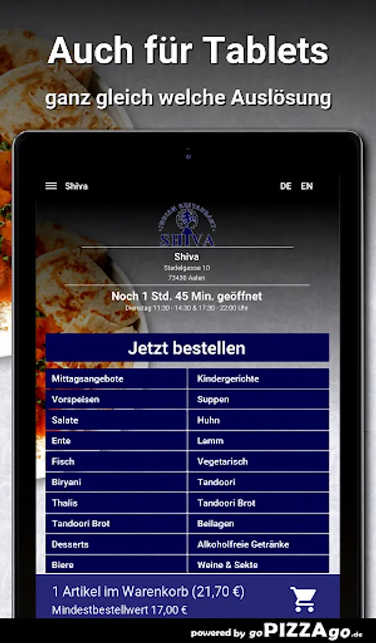 Cravings for Indian? .. no problem with Shiva in AalenMake a delicious excursion into the culinary art of India with us. Tasty Mint Prantha is available for 3.50 euros, Mutton Nilgiri, and excellent Karahi Paneer for 10.40 euros. Shiva has Tandoori Chicken for just 12.20 euros, Fish Pakora can be ordered for 5.90 €, Chicken Palak (11.60 €), Dal Makhni and Chicken Tikka (12.20 €).