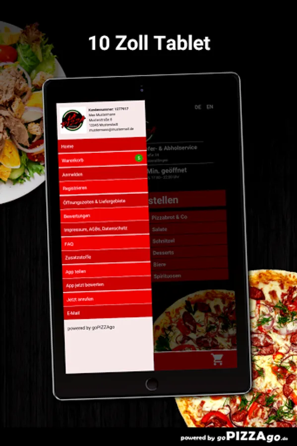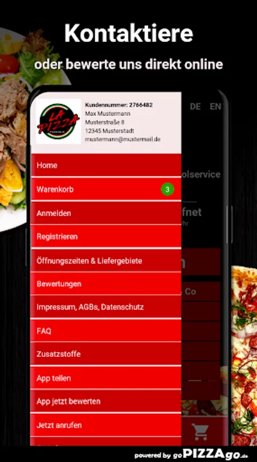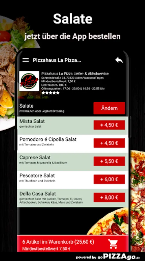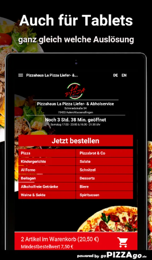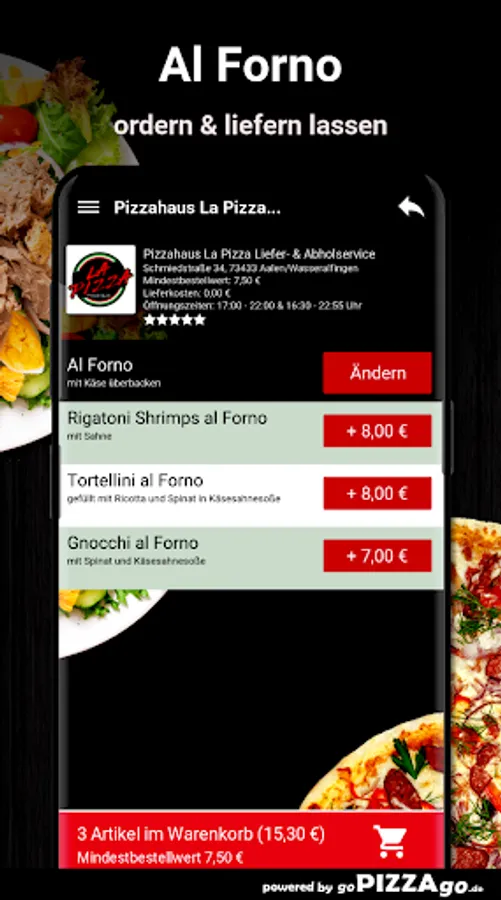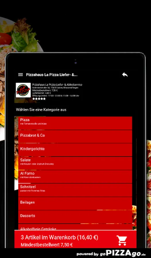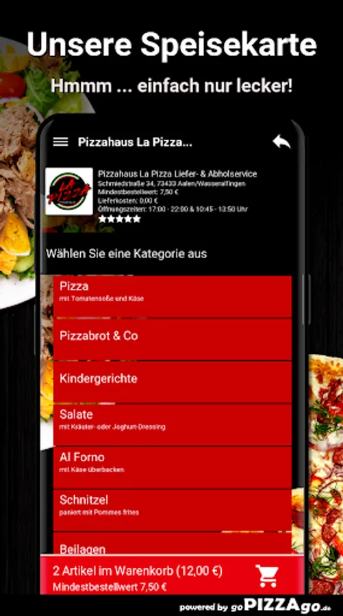 You can order delicious and fresh dishes on our website from our delivery service Pizzahaus La Pizza Delivery & Pick-up Service here. Our menu offers 94 delicacies such as Pizza Tonno for € 6.50 or Pizza Capricciosa for € 7.00. The youngsters can choose from numerous dishes such as Pizza Kid Danger for EUR 4.00, Pizza Ladybug for EUR 5.00, Pizza bread for EUR 4.00. Customers are very happy to order thisWhen do we deliver?