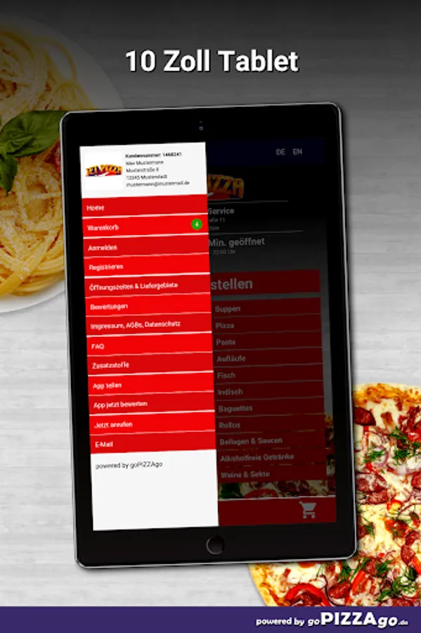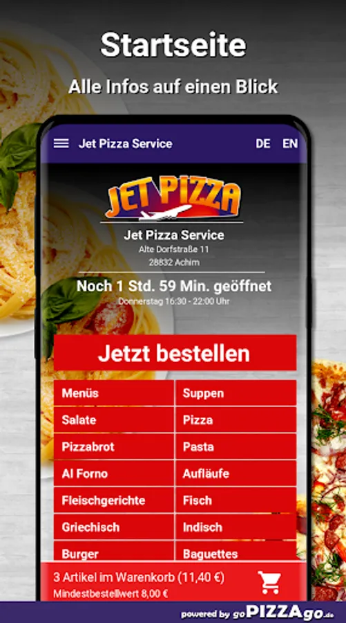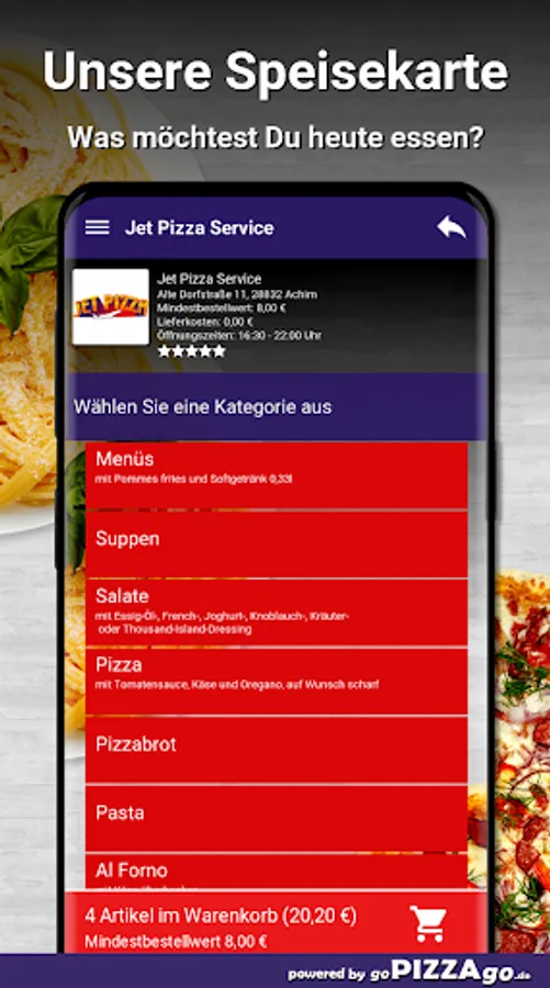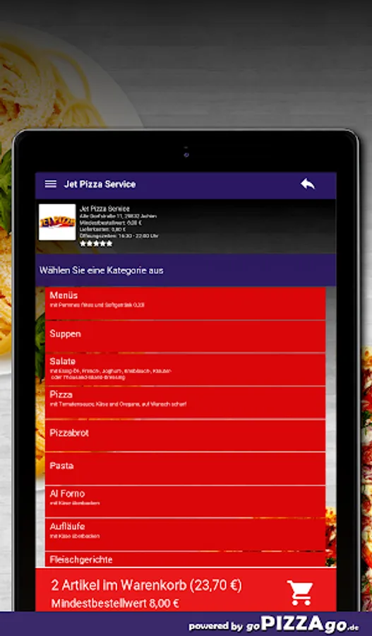 You can order and pay for delicious dishes and feasts online with our pizza service. On our online menu you will find 326 freshly prepared dishes such as kebab baguettes, Naples pizza, turkey cream schnitzel and turkey schnitzel Hawaii special for €9.00. We also have a large selection of soft drinks on our menu: Coca-Cola light, Fanta, water. Of course we also have delicious dishes for the little ones such as Kiddy-Box chicken burger for EUR 6.50, Kiddy-Box hamburger for € 6.50, Kiddy-Box schnitzel for € 6.50 deliver dishes
