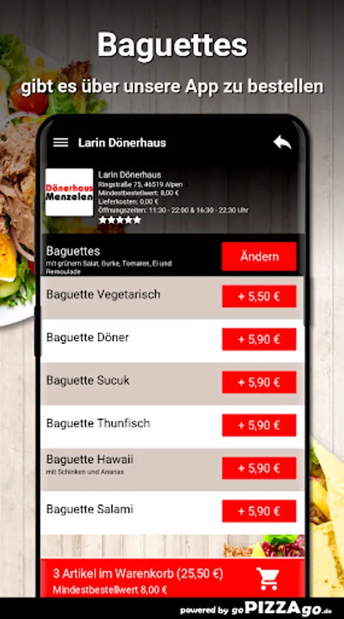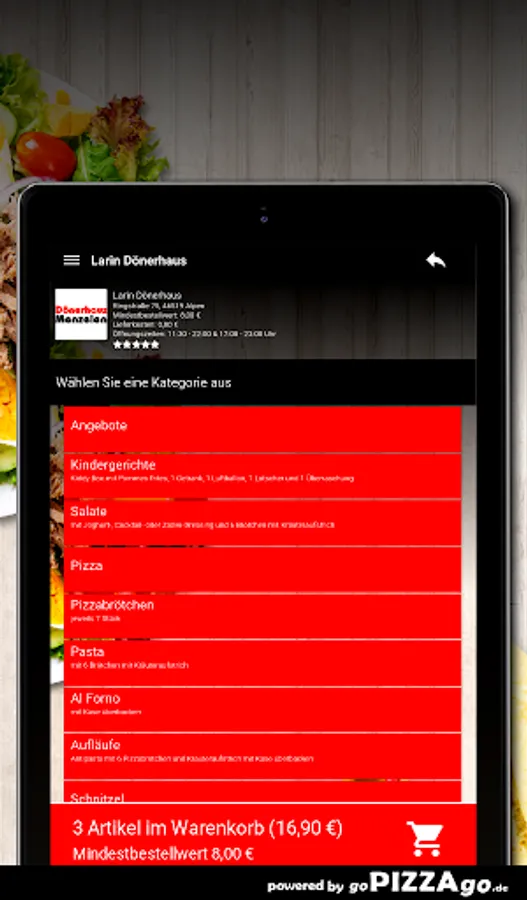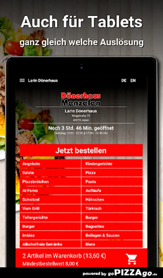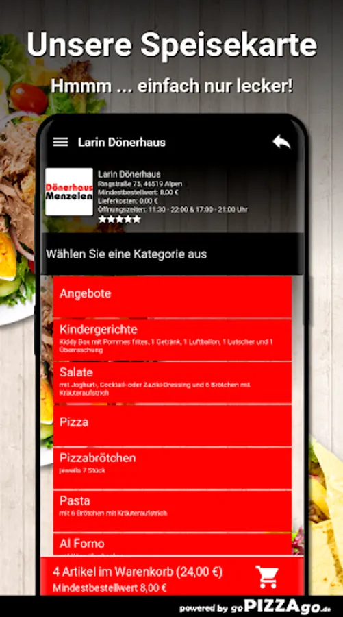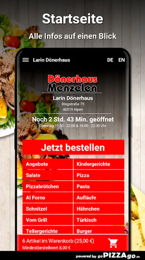 You can order and pay for a wide variety of dishes in our online shop at our Larin Dönerhaus delivery service in Alpen. We have 243 varied dishes (Pollo Funghi chicken breast fillet, Insalata Primavera, Insalata Frutti de Mate). Boys & Girls can choose from numerous fresh dishes such as children's kebab for 3.70 euros, kiddy box with 3 chicken nuggets for € 5.50, kiddy box with kebab meat for € 5.50. You can order top sellers from us at these times