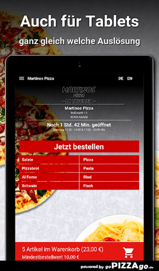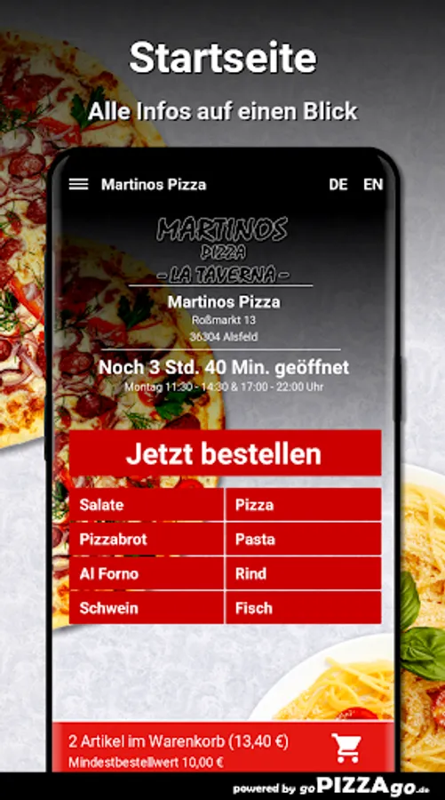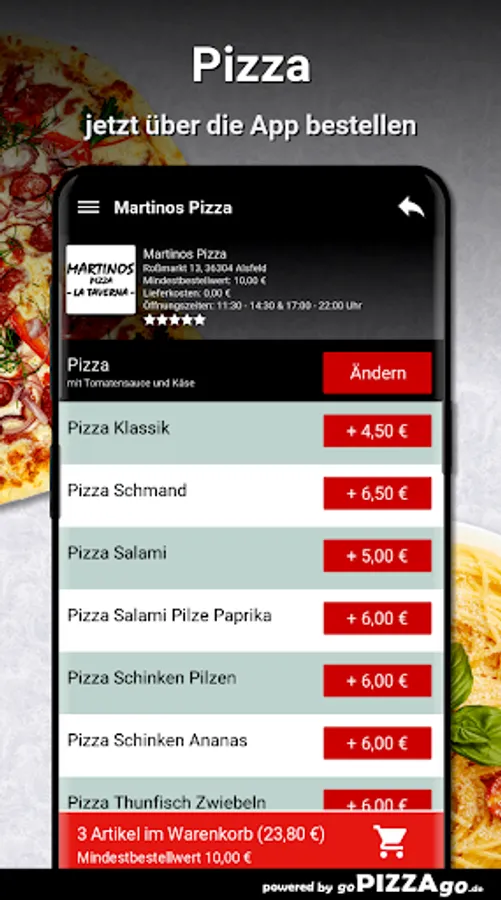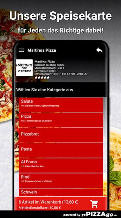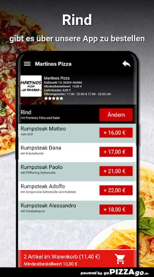 You can safely order a lot of delicious specialties from our delivery service Martinos Pizza in Alsfeld. We offer you more than 63 meals such as tomato basil pizza, classic pizza, rump steak matteo, tortelloni principessa, rump steak Dana, tortelloni torteldoro as well as rump steak dana for 17.00 euros.