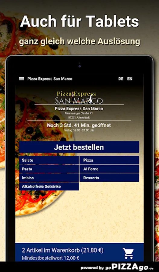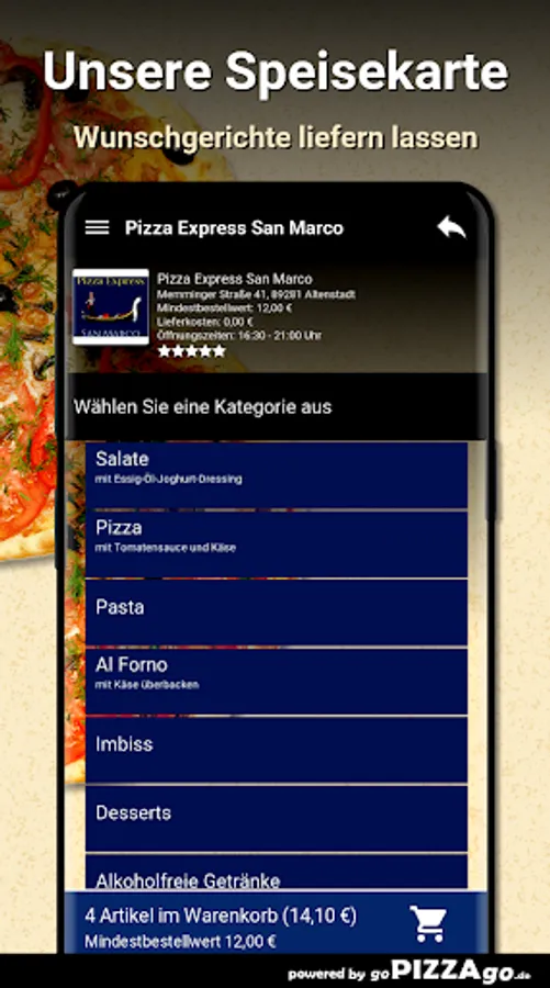 You can conveniently order and pay online from a large selection of varied dishes from the Pizza Express San Marco delivery service (Memminger Strasse 41 in Altenstadt). Of course, you can expect a tasty range of over 109 meals, including a pizza of your choice, spaghetti Bolognese, spaghetti diavolo, salad Contadino, cucumber salad, pizza spinaci e gorgonzola, pizza caprese, gnocchi quattro or perhaps green salad for 5.00 euros. Do you fancy something sweet? Then order a dessert like Ben & Jerry's Peanut Butter Cu, Ben & Jerry's Fudge Brownies, Ben & Jerry's Cookie Dough. You can order our 7 top hits at these times