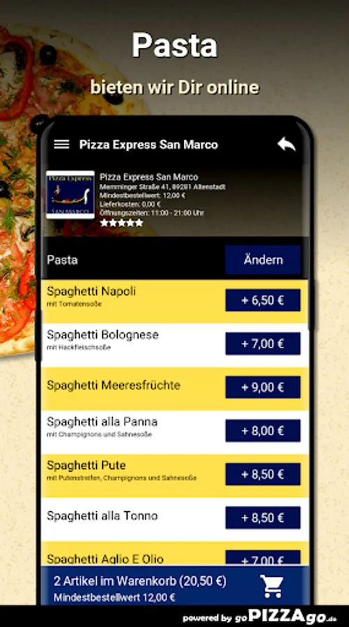 Napoli or Frutti di Mare? ... simply totally tasty: Pasta & noodles from the delivery service Pizza Express San MarcoTotally delicious pasta dishes are available here at Pizza Express San Marco that you can easily order online. You can get handmade tortellini carbonara for 8.50 euros, delicious spaghetti alla panna, spaghetti Aglio E Olio for 7.00 euros, due pasta lasagne and penne or spaghetti carbonara with turkey ham and egg.