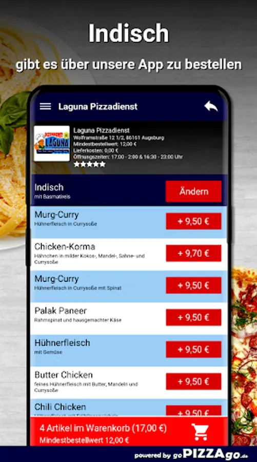 Baked pasta dishes from Laguna Pizzadienst Augsburg Our range of 9 delicious specialties is a delicious mix and certainly something for every palate. Fried potato casserole, pleasantly spiced various noodles curry sauce, Laguna Pizzadienst has you for just € 7.00, various noodles, vegetable curry, chicken-pineapple casserole. Lasagna is delivered to you for € 7.00, as is lasagna spinach.