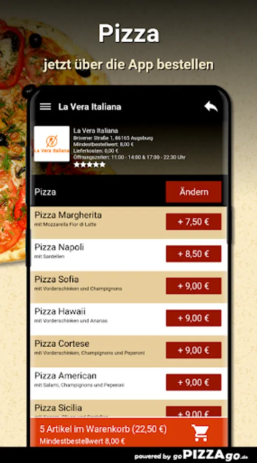 Nothing easier than that: Order pizzas in La Vera Italiana Augsburg ... Absolutely crispy pizza is available here at La Vera Italiana and can be quickly delivered. The delivery service brings you pizza Hawaii with ham and pineapple at a price of 9.00-16 €, Pizza Italiana Special is available from La Vera Italiana for only 11.00-20.00 €, crispy baked and the topped pizza Salmone is available from La Vera Italiana can be ordered and delivered for only € 10.50-19.00 & Pizza Mexicana.