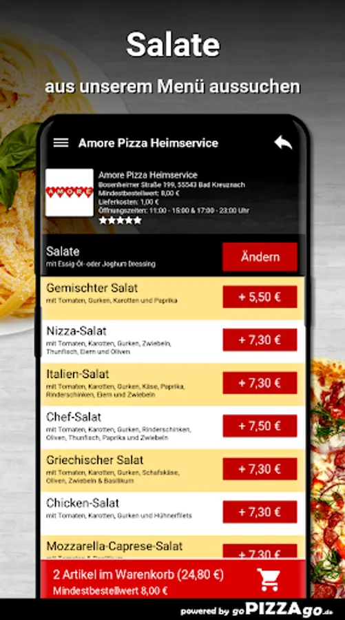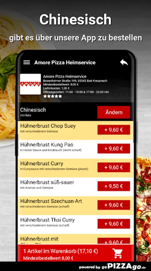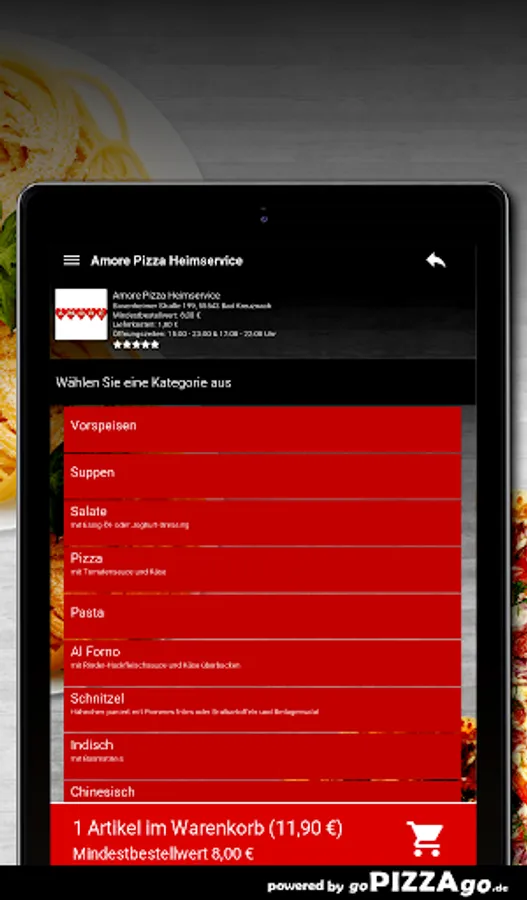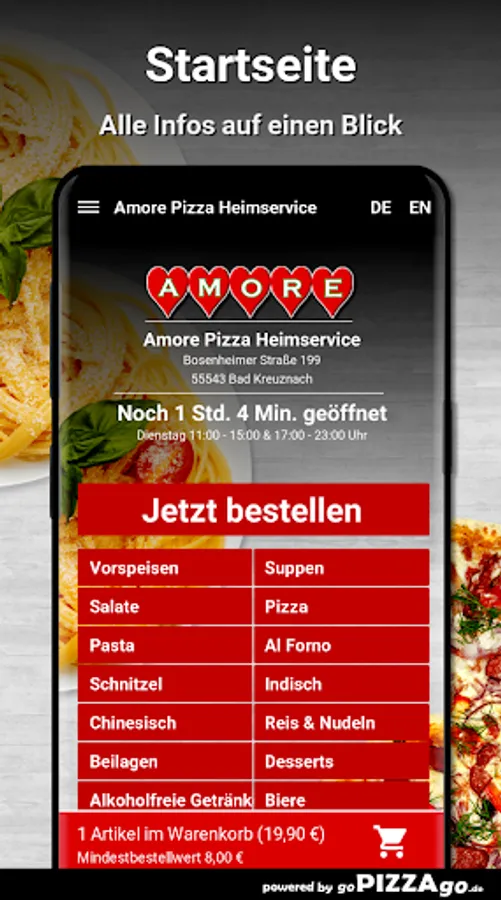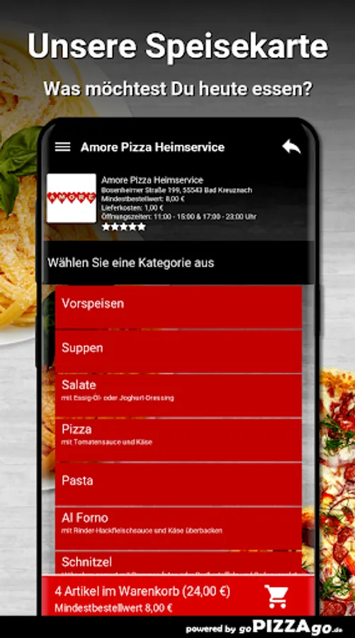 Amore Pizza Heimservice - schmackhaftes Essen nach Bad Kreuznach liefern lassenBei uns im Angebot: Indisch, Chinesisch, Pasta, Pizza, Vorspeisen, Schnitzel, Reis & Nudeln, Al Forno zum online bestellen?