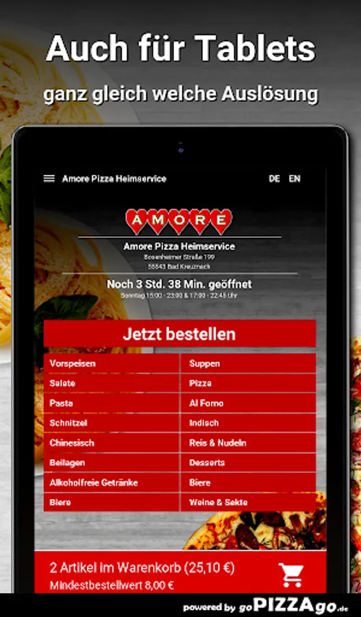 Du kannst irre viele frisch zubereitete Gerichte bei unserem Heimservice Amore Pizza Heimservice in Bad Kreuznach easy online ordern. Unser Online-Angebot umfasst mehr als 223 Schlemmereien wie Fischfilet paniert mit Gemüse, Curry Ente, Tortellini Bolognese, Pizza Solemio, Pizza Peperoni, Rindfleisch Curry sowie Pizza Chef für 7,20 EUR. Nach dem Essen schlagen wir einen Süßspeise vor: Gebackene Banane, Tiramisu, Gebackener Apfel, Gebackene AnanasDas wird sehr gerne online bestellen!Wann wir Dein Essen bringen