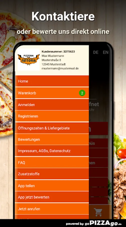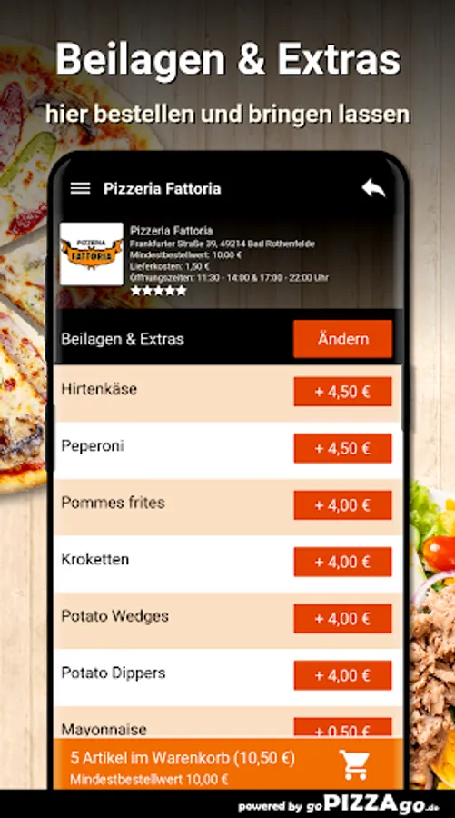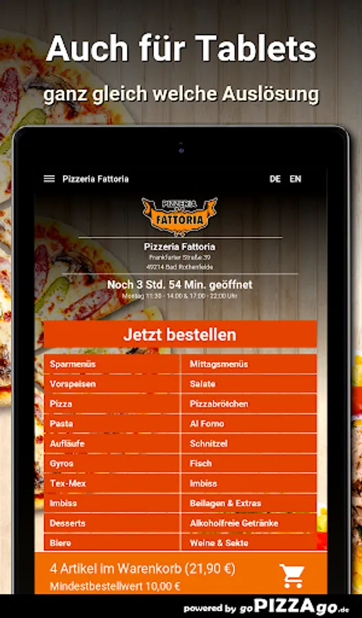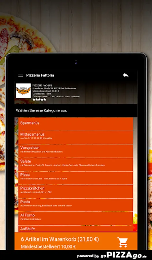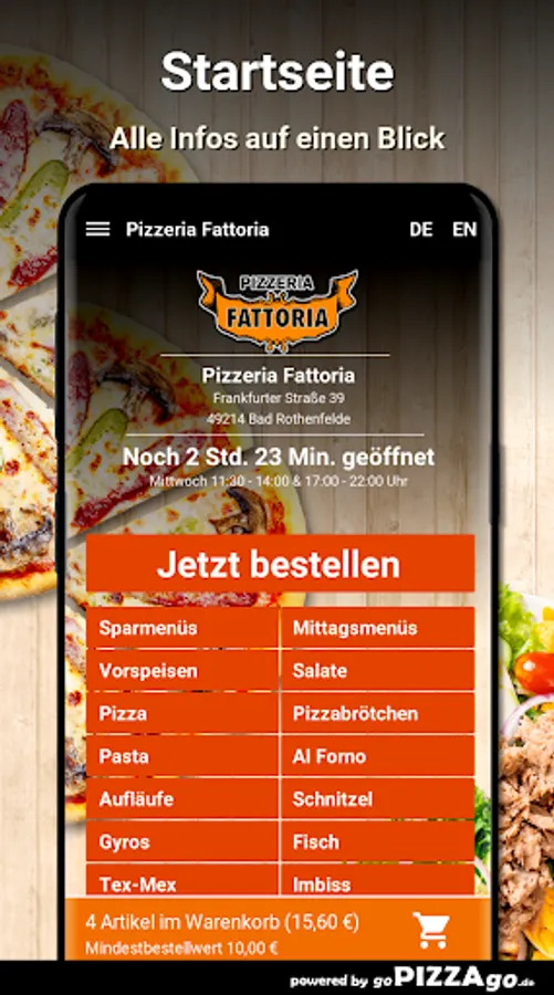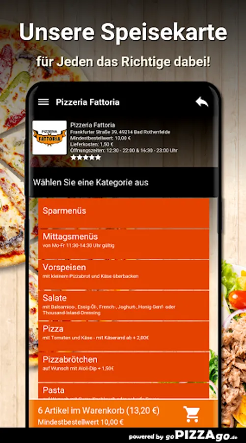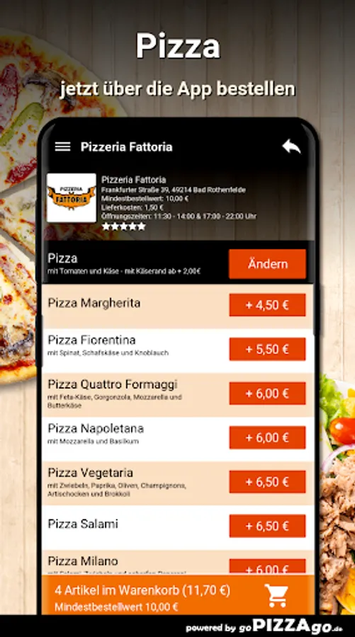 Of course, you can order from us quickly and easily under numerous food or drinks and have them delivered in our online shop. Of course, you can expect a fine selection of over 191 feasts, Tagliatella Amatriciana, Verdura Gratinata, Pizza Gyros Hollandaise, Insalata Capricciosa, Spaghetti with prawns, Cotoletta alla Milanese. Our kitchen also has a lunch menu such as lunch menu Tre III, lunch menu Quattro IV, lunch menu Uno I, lunch menu Due II. The hits at Pizzeria FattoriaOur opening times